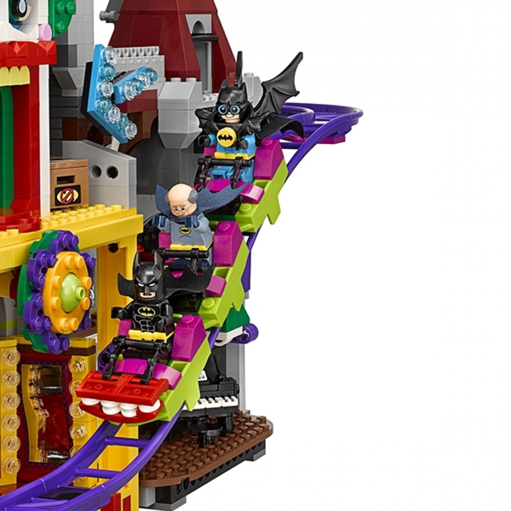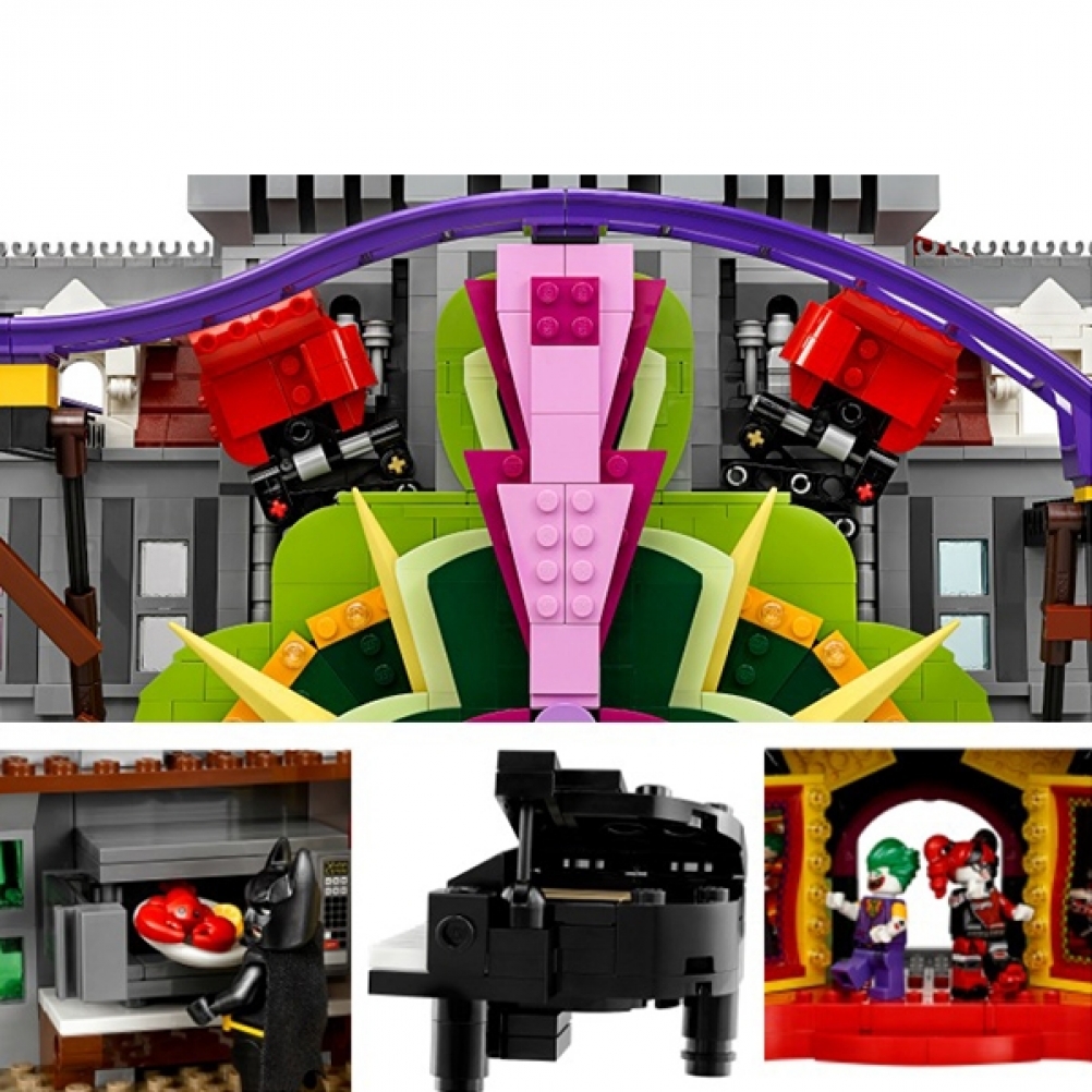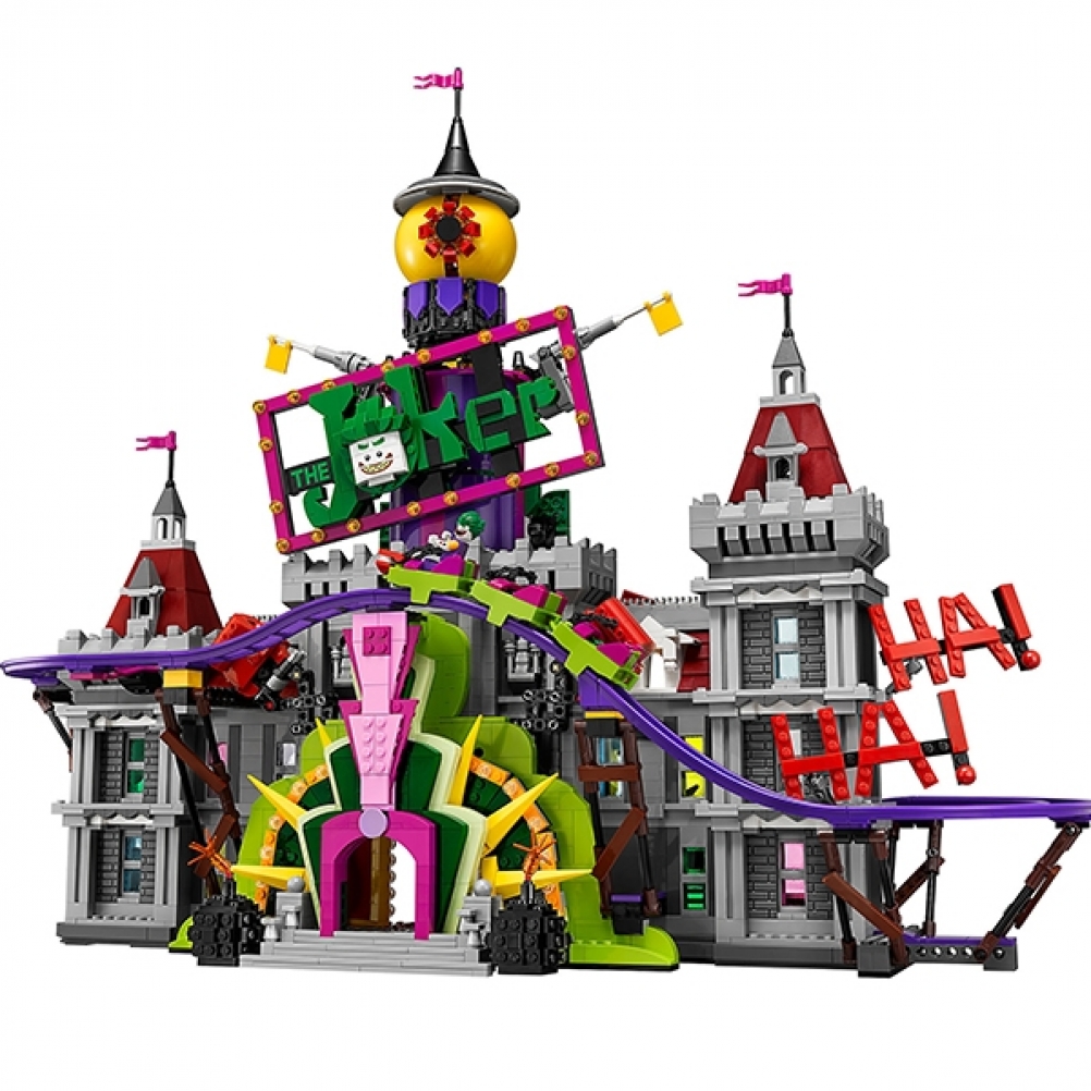 Contiene un grande ingresso fiancheggiato da 2 bombe costruibili con elementi scintilla trasparenti, torri a due e tre livelli con torrette ed elementi bandiera in cima, ottovolante con treno e 3 carrozze (ognuna con sedile per minifigure), torre “grande occhio” girevole con iride a leva per “guardare” verso l’alto e verso il basso, enorme testa di Joker™ costruibile con botola e scivolo, insegna del Joker “Ha! Ha!” dondolante, 2 guanti da boxe azionabili tramite rotellina, più diversi elementi luce decorativi, trasparenti e multicolore.