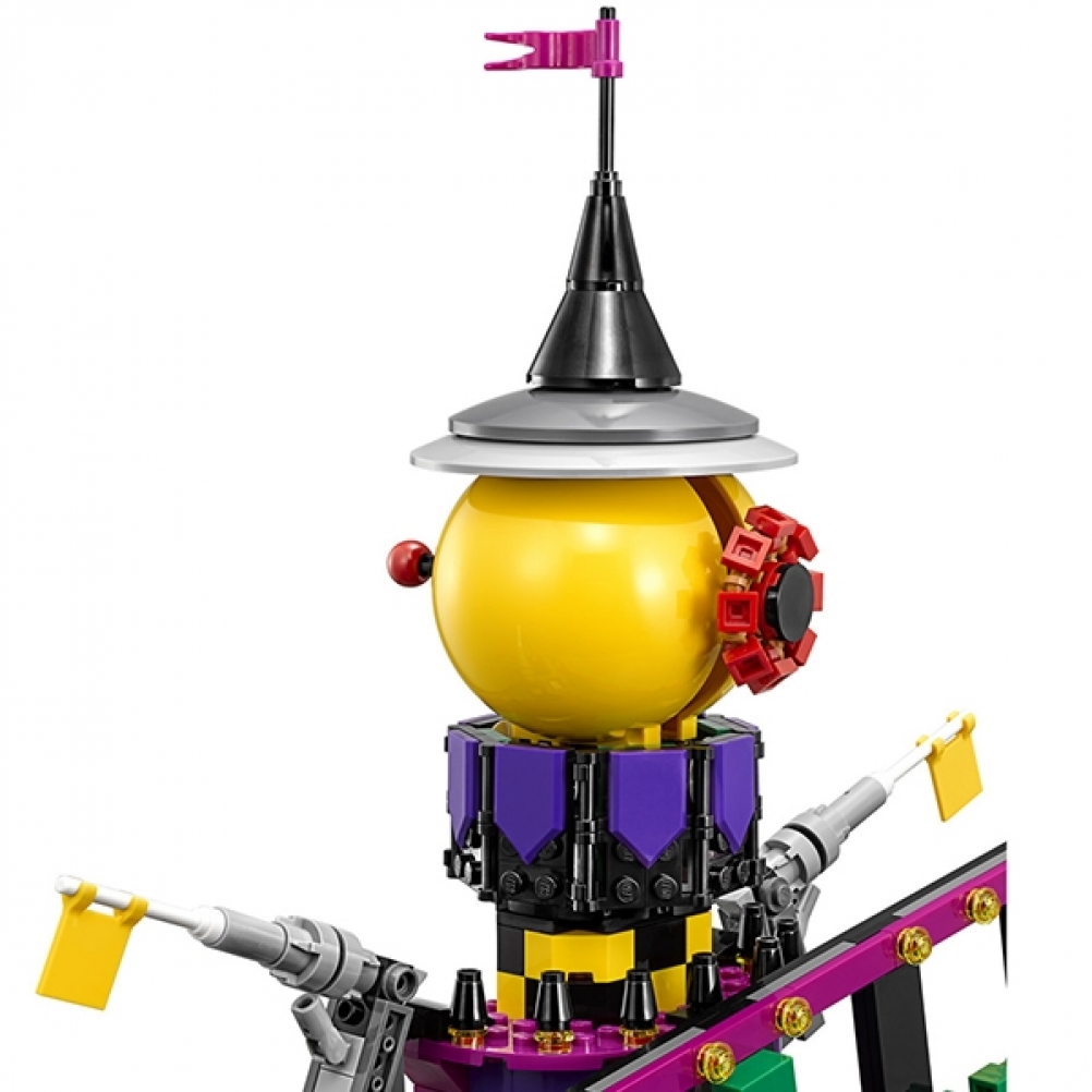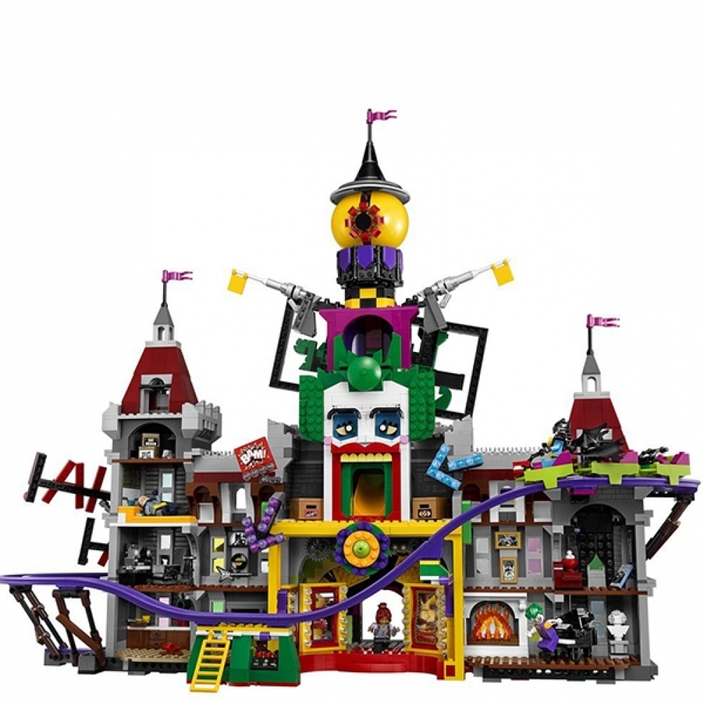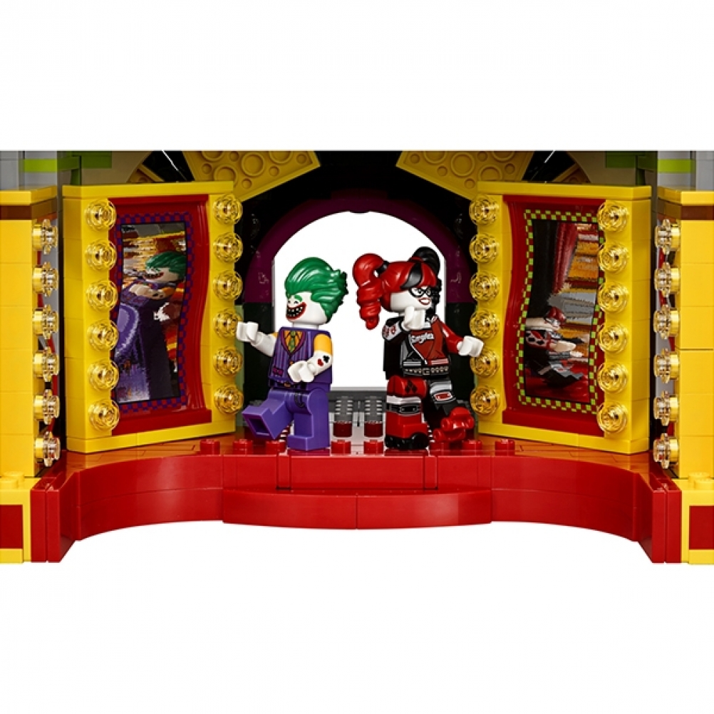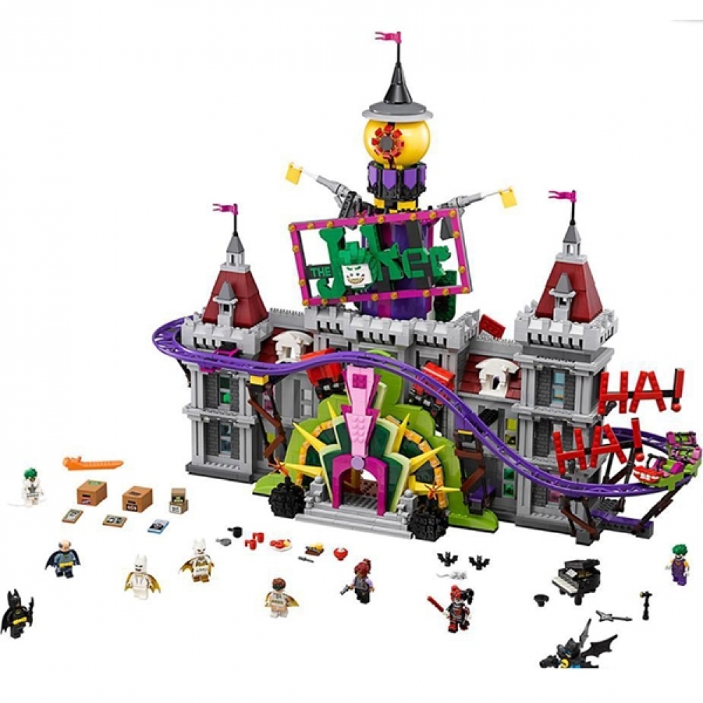 Contiene un grande ingresso fiancheggiato da 2 bombe costruibili con elementi scintilla trasparenti, torri a due e tre livelli con torrette ed elementi bandiera in cima, ottovolante con treno e 3 carrozze (ognuna con sedile per minifigure), torre “grande occhio” girevole con iride a leva per “guardare” verso l’alto e verso il basso, enorme testa di Joker™ costruibile con botola e scivolo, insegna del Joker “Ha! Ha!” dondolante, 2 guanti da boxe azionabili tramite rotellina, più diversi elementi luce decorativi, trasparenti e multicolore.