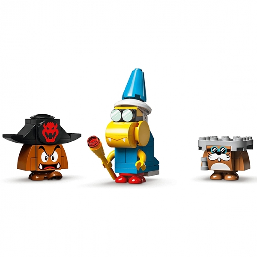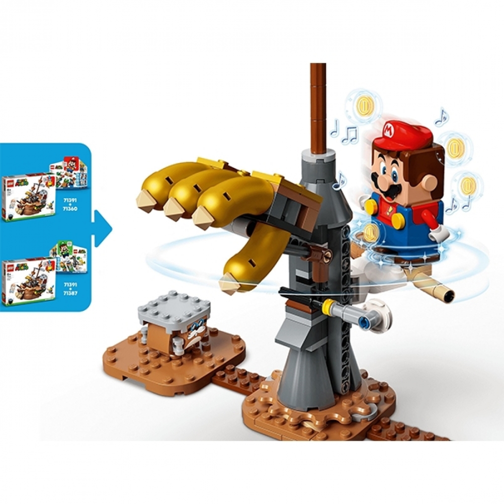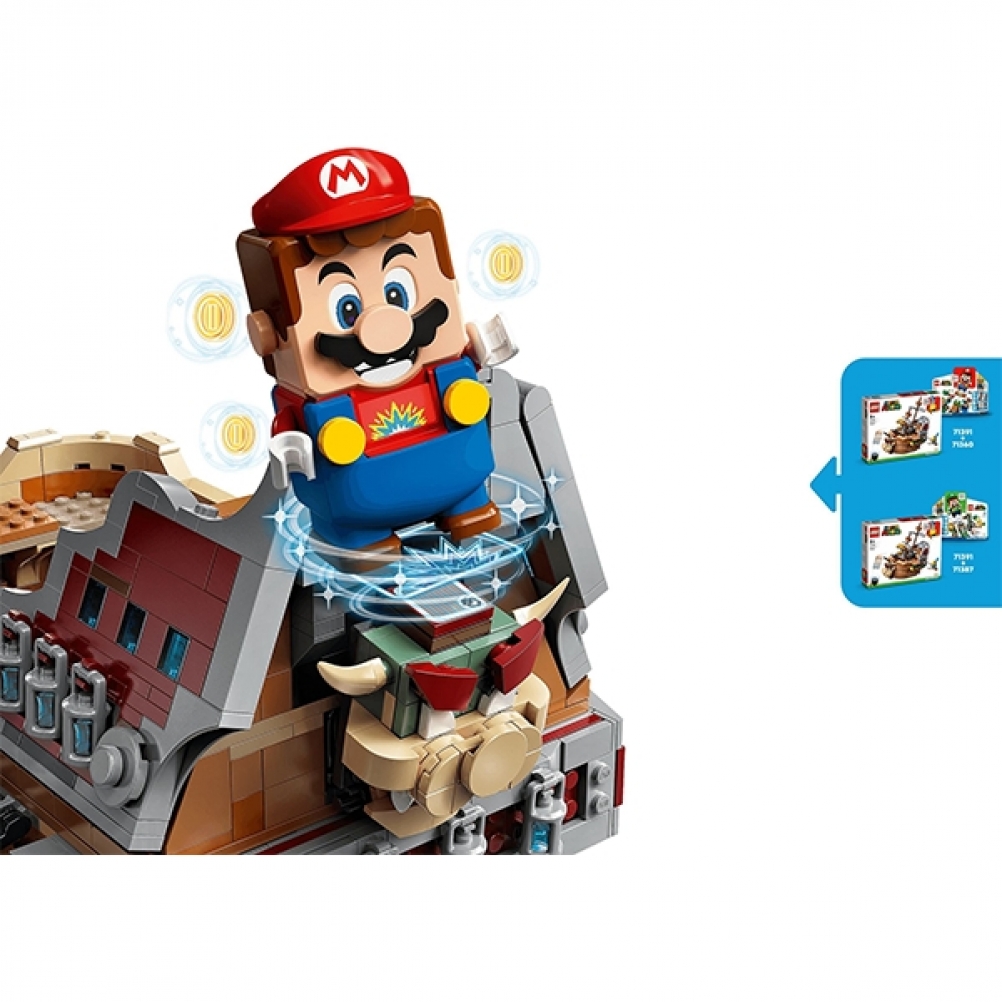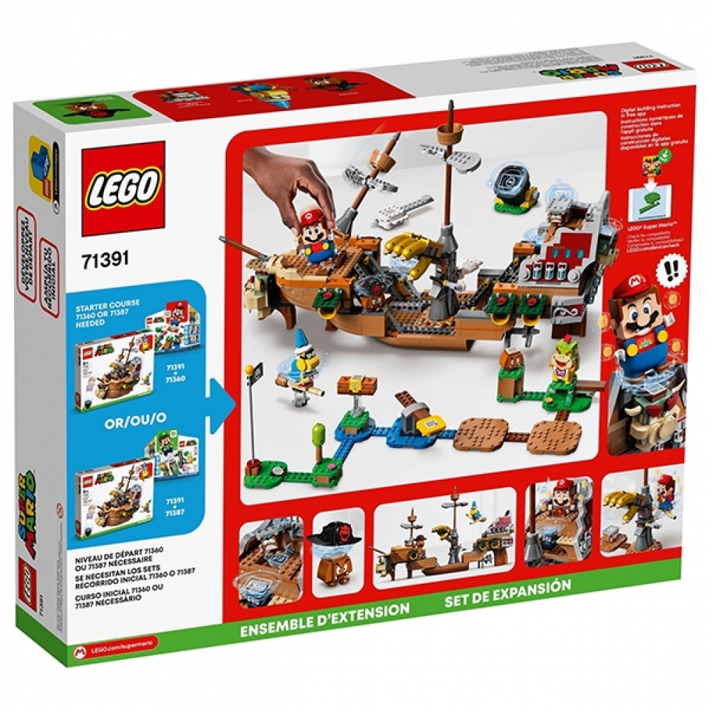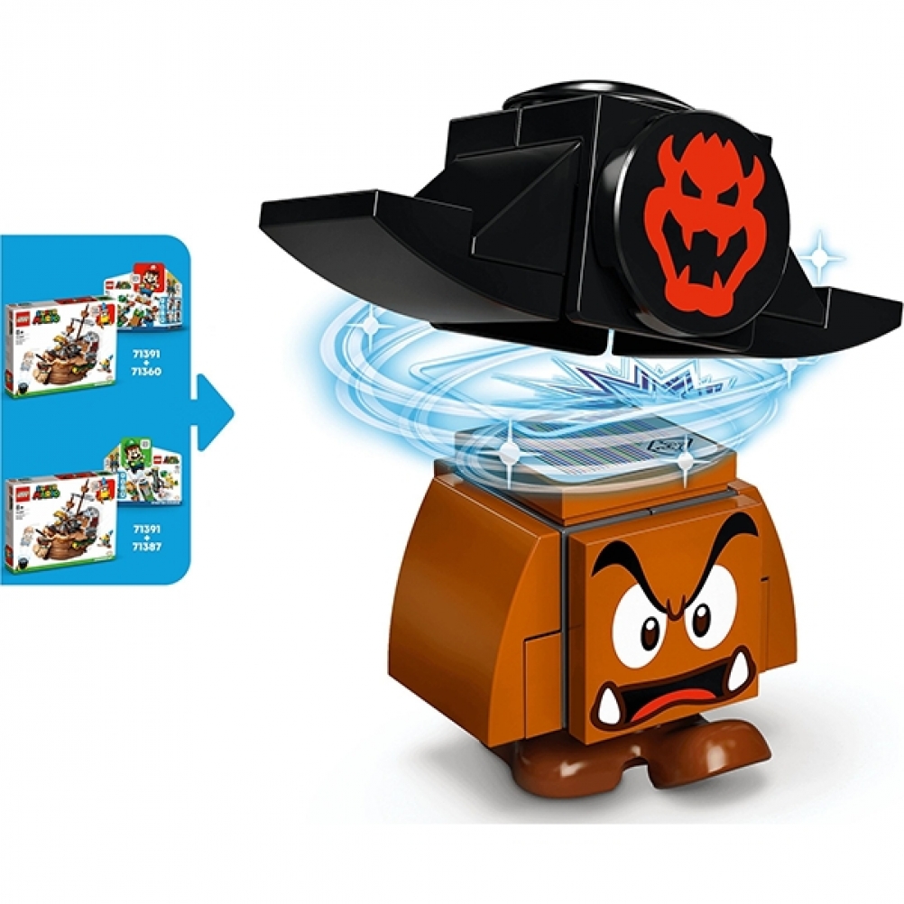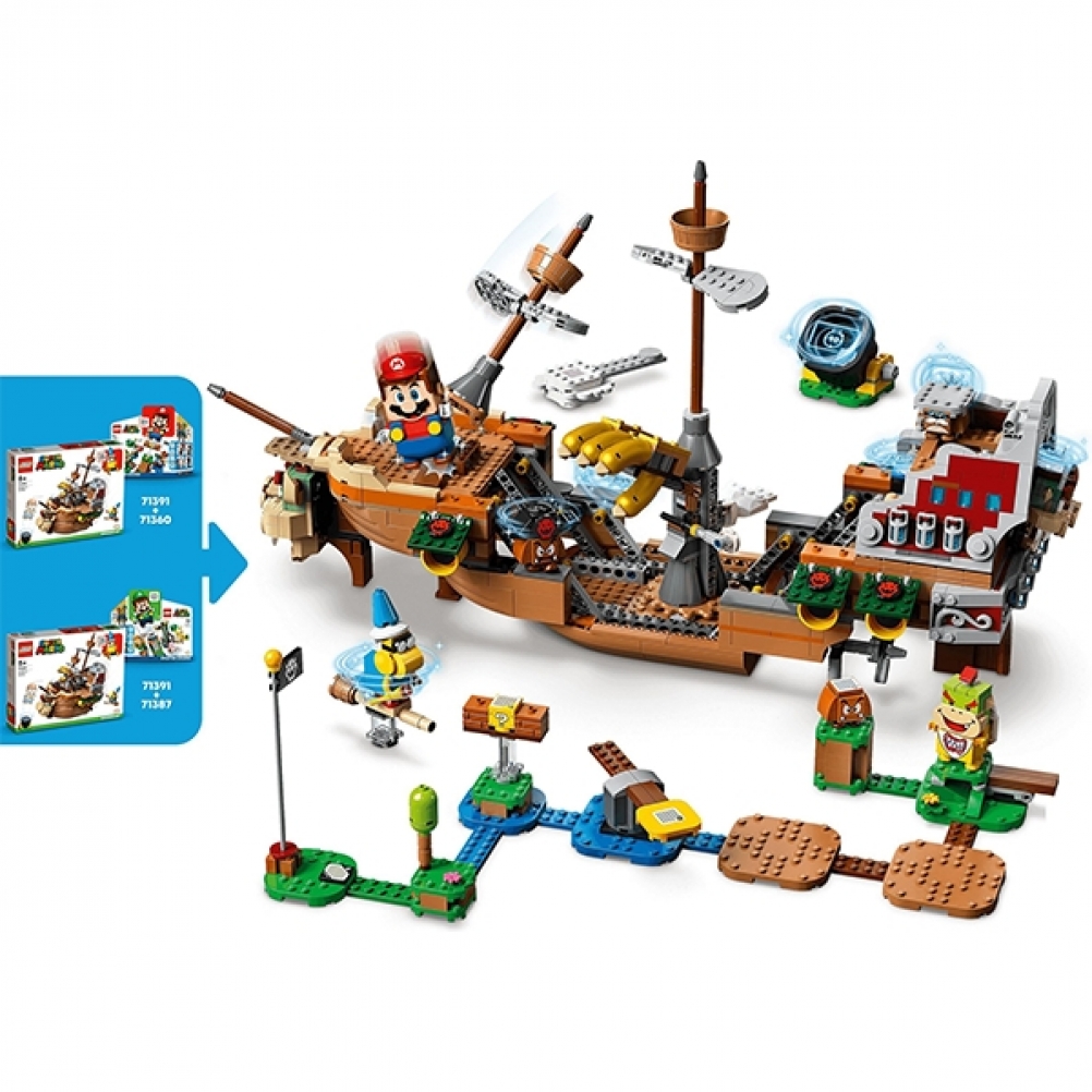 Con questo Pack di espansione (71391) i bambini possono costruire l’iconico veliero volante di Bowser per esporlo e per migliorare il proprio universo LEGO® Super Mario™. Il veliero può essere disposto in "modalità volo" o ripiegato in "modalità rotta". I giocatori dovranno superare sfide come la mano meccanica di Bowser e un blocco POW per far apparire una Tartatalpa dal suo nascondiglio. (Nota: per poter giocare è richiesto lo Starter Pack 71360 o 71387).
