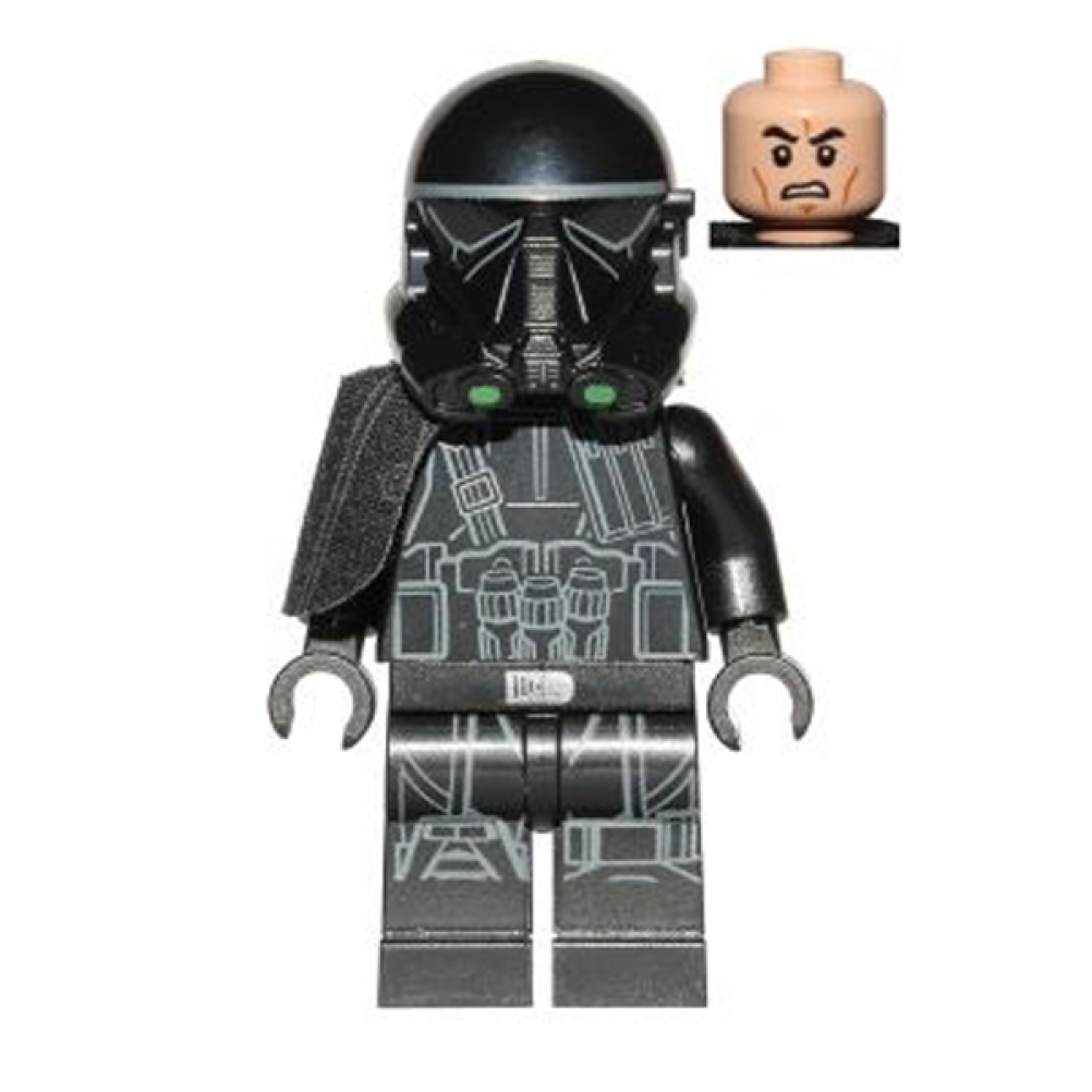 Minifigure Imperial Death Trooper con armatura nera dettagliata, casco integrale con visiera verde scura e torso stampato. Specialista o comandante del Primo Ordine, pronto per missioni segrete e combattimenti d’élite.