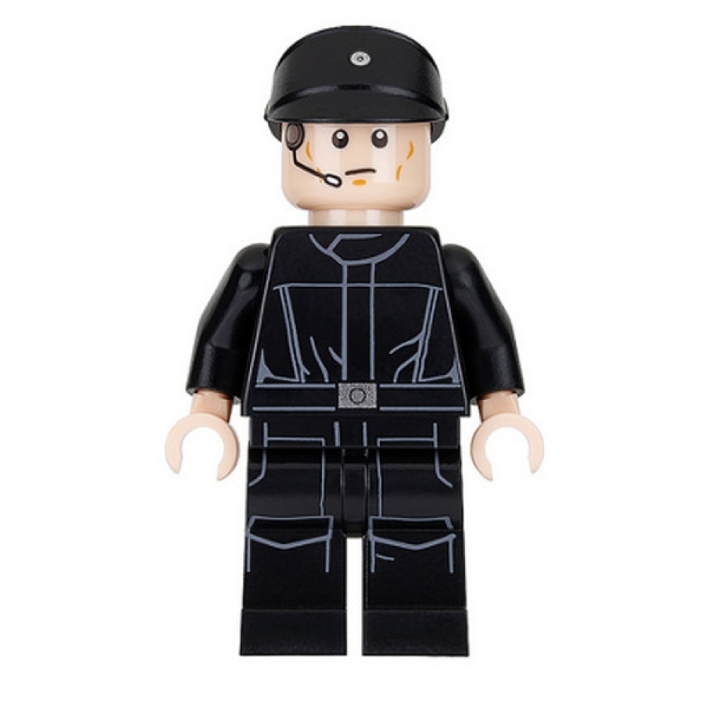 Indossa una tuta nera con stampa dettagliata sul torso, gambe nere abbinate e casco nero classico da pilota imperiale. La testa light nougat mostra un volto serio e determinato.