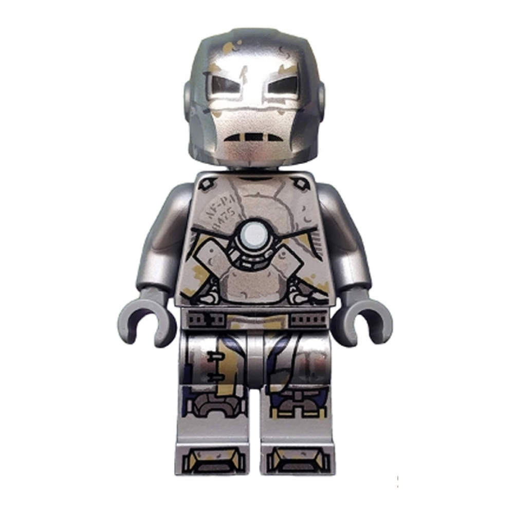 La minifigure Iron Man - Mark 1 Armor rappresenta Tony Stark nel suo primo, primitivo costume di Iron Man, realizzato in metallo grigio con dettagli semplici e robusti. La figura include una testa trasparente (Trans-Clear) che simula l'effetto della visiera del casco, mostrando il volto di Stark all'interno dell'armatura. Questo design richiama il debutto del personaggio nella saga di Iron Man.