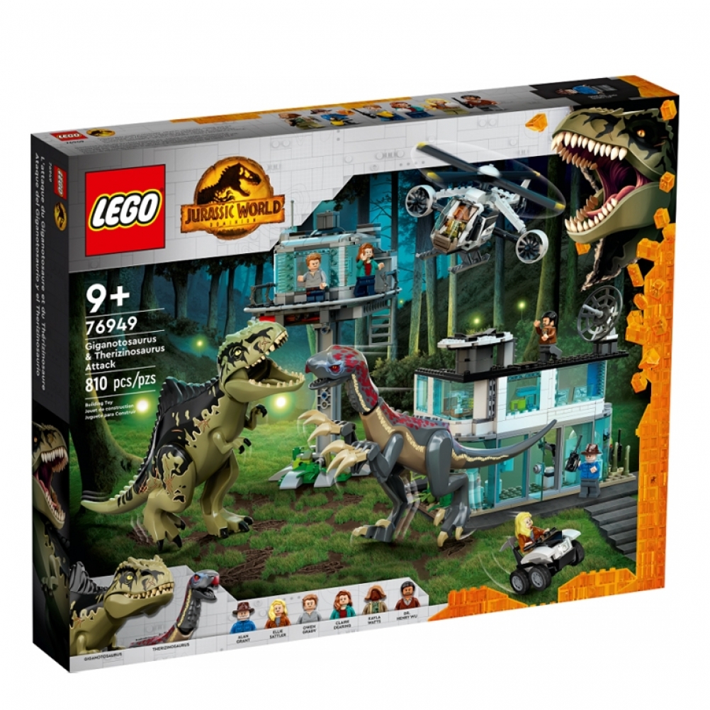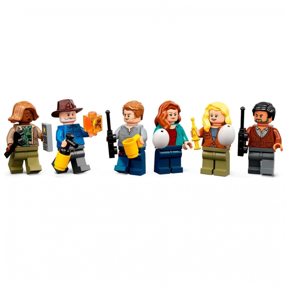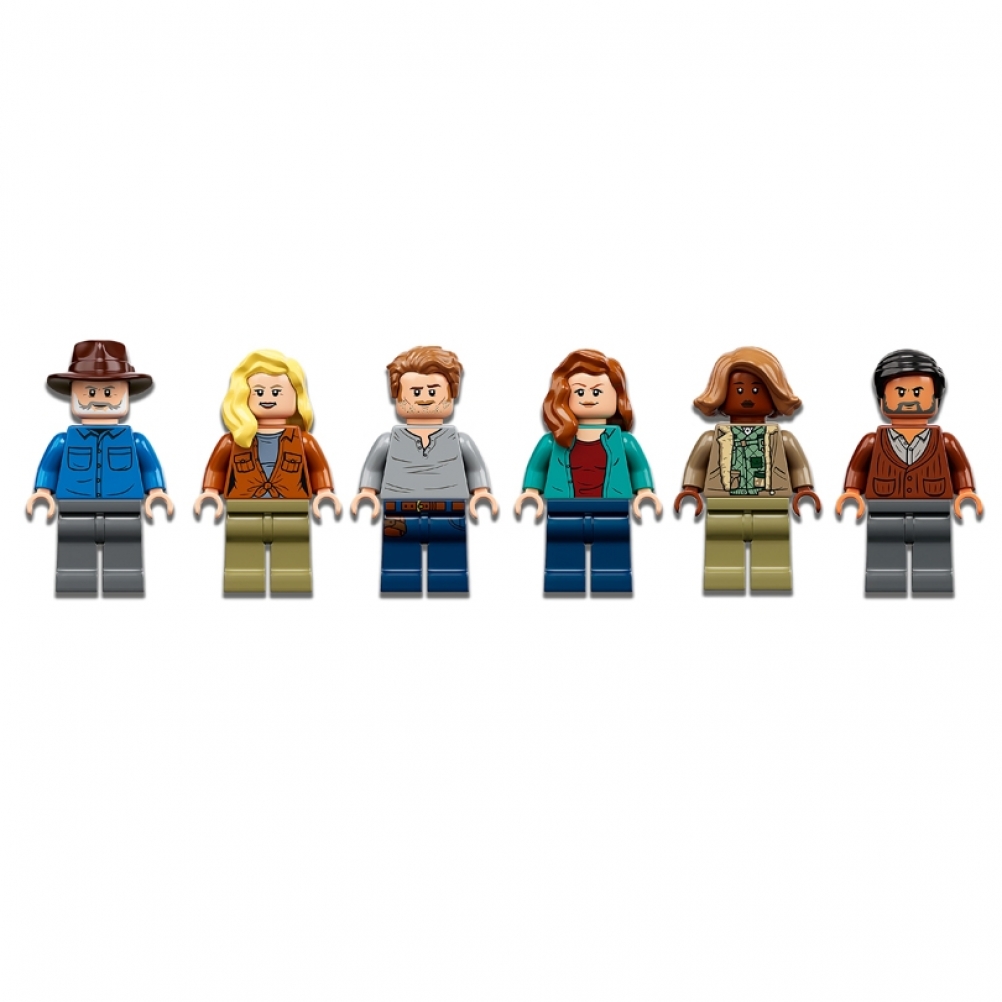 - 6 minifigure: Owen Grady, Claire Dearing, Dott. Alan Grant, Dott. Ellie Sattler, Kayla Watts e Dott. Henry Wu, più un Giganotosauro lungo 32 cm e a un Terizinosauro