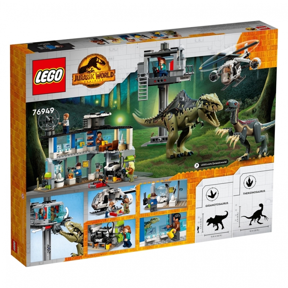 - Lotta tra dinosauri: con questo playset L’attacco del Giganotosauro e del Terizinosauro LEGO® Jurassic World (76949) è possibile ricreare duelli tra dinosauri e rivivere l’azione del film Jurassic World Dominion