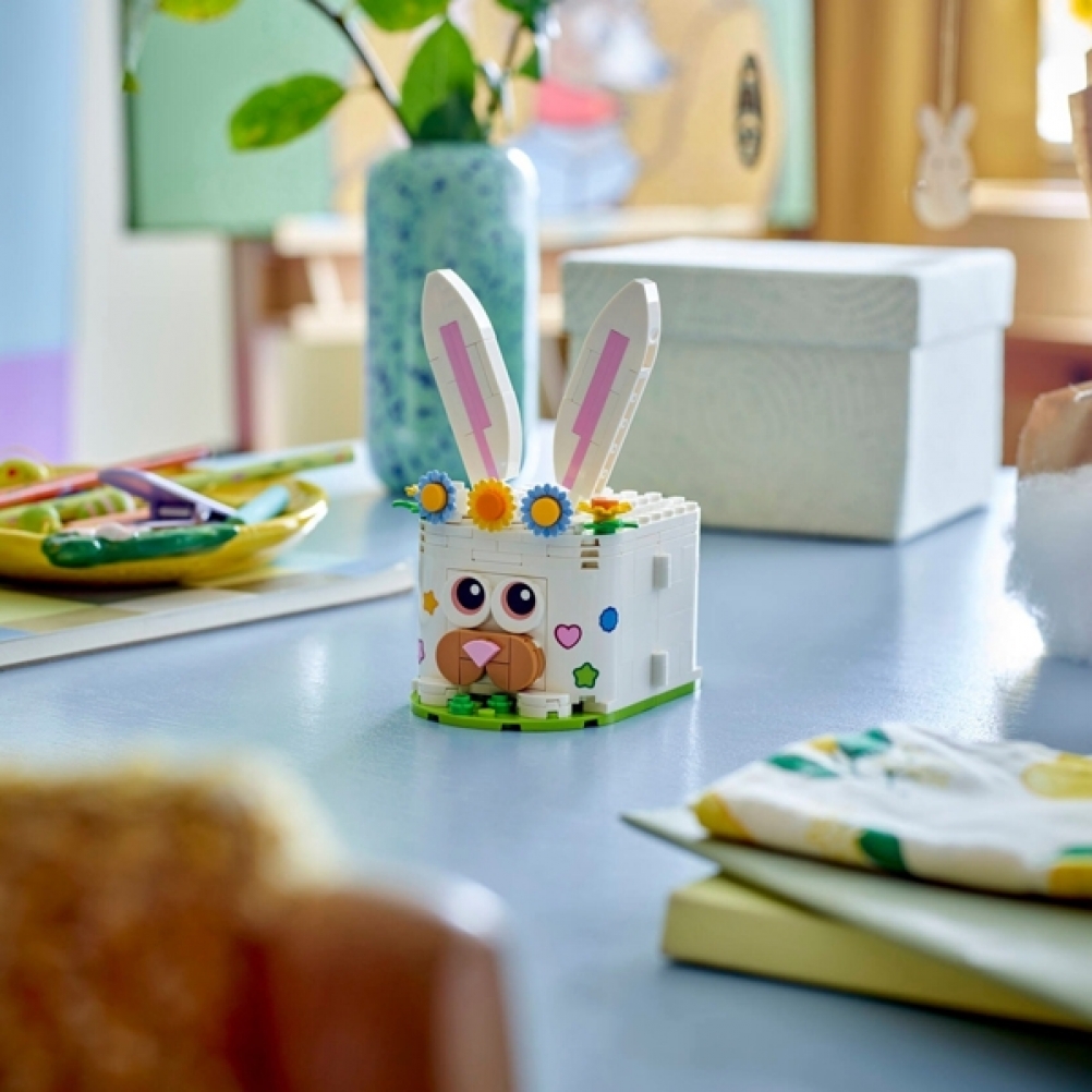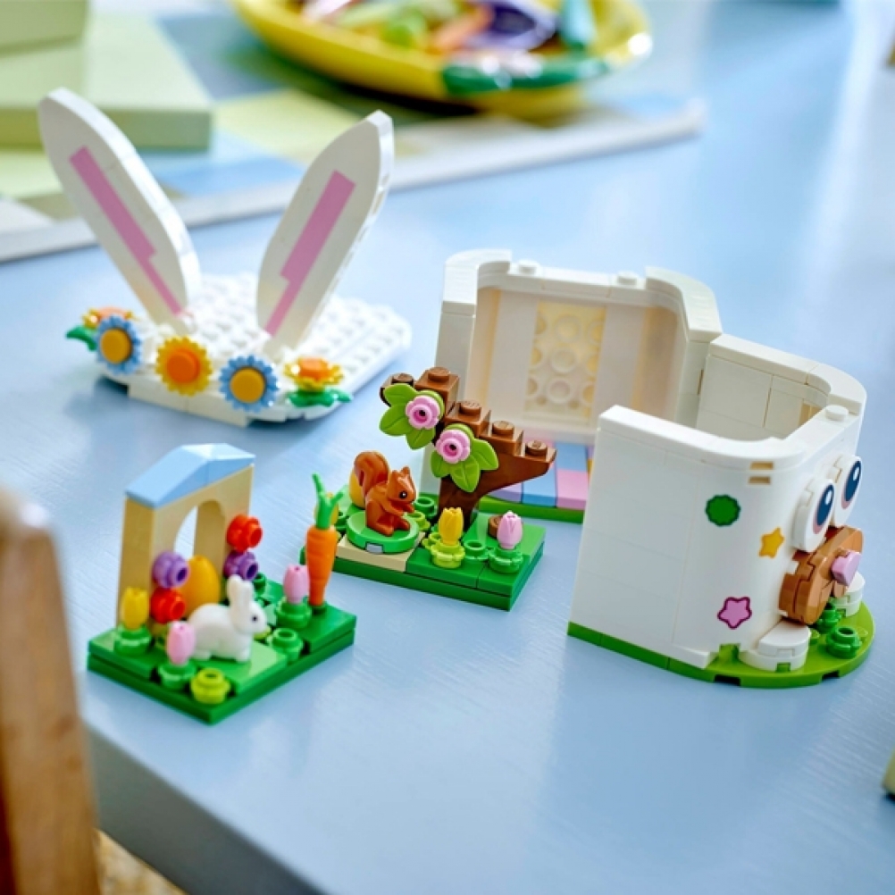 - Decorazione primaverile per la casa: la scatola è dotata di coperchio rimovibile con orecchie mobili in mattoncini e una corona di fiori, oltre ad adesivi per personalizzare il viso e il corpo del coniglio