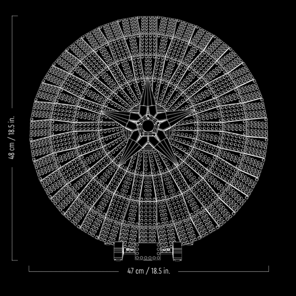 Il modello di 3.128 pezzi misura 47 cm di diametro e poggia su un supporto che incorpora una targhetta. Per maggiore comodità, una versione digitale delle istruzioni per la costruzione del set è disponibile nell’app LEGO Builder.