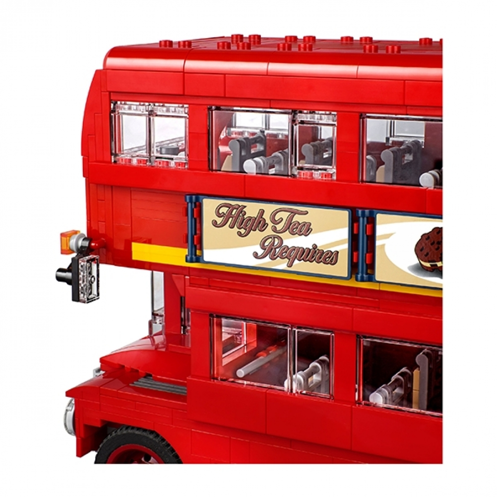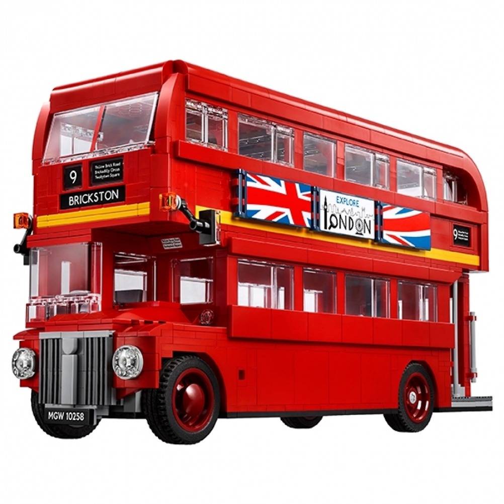 Il bus di Londra è dotato di numerose funzioni e dettagli in mattoncini, tra cui ampi finestrini, carrozzeria curva con livrea rosso brillante, parabrezza panoramico, etichette stampate di poster reversibili con pubblicità, pneumatici con battistrada appositamente realizzati e un display della destinazione. È anche dotato di cofano apribile con motore, cabina di guida dettagliata con porta scorrevole e di tetto e piano superiore rimovibili per accedere all'interno.