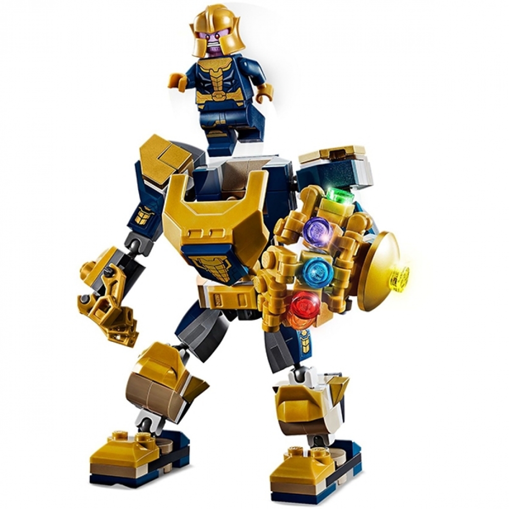 Il mech Thanos è una versione più grande di Thanos ed è dotato del suo inconfondibile pettorale. Viene fornito con il potente Guanto dell'Infinito, completo di 6 Gemme dell'Infinito, e la minifigure di Thanos pilota, novità di gennaio 2020.