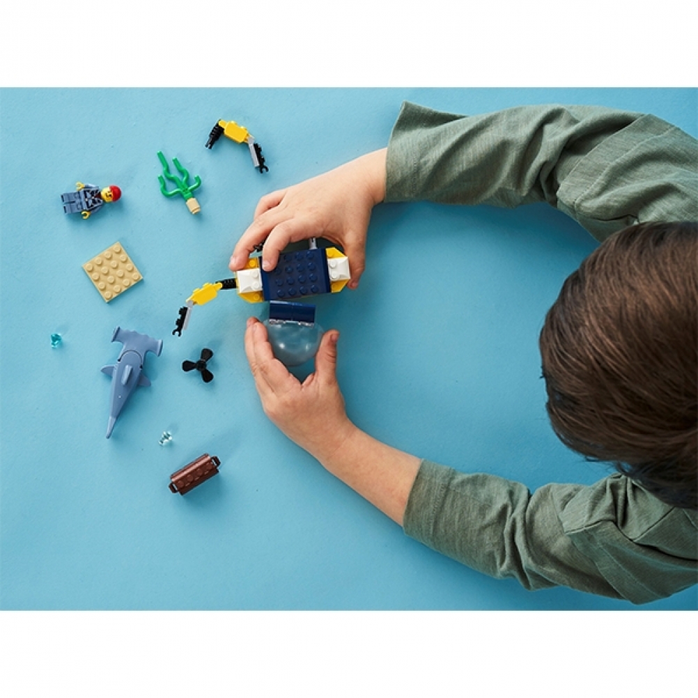 I bambini possono immergersi nel gioco creativo con questo playset del Minisottomarino oceanico LEGO® City (60263). Ci sono un sottomarino giocattolo con cabina di pilotaggio a bolla e bracci d’ispezione, un forziere pirata con gemme e uno squalo martello. Questo kit di costruzione ha tutto quello di cui i bambini hanno bisogno per fantasiose avventure subacquee.