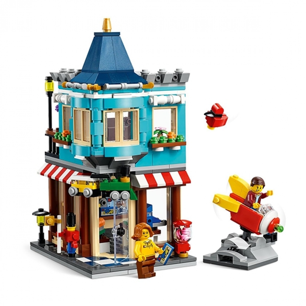Il negozio di giocattoli a 2 piani con appartamento, soldatino in mattoncini, insegna con trenino e distributore di gomma da masticare, giostrina del razzo funzionante, tanti giocattoli e dettagli è un fantastico regalo di Natale o di compleanno per bambini dagli 8 anni in su.
