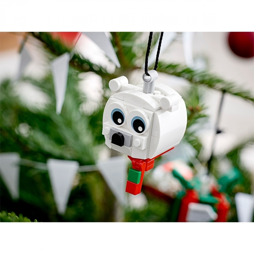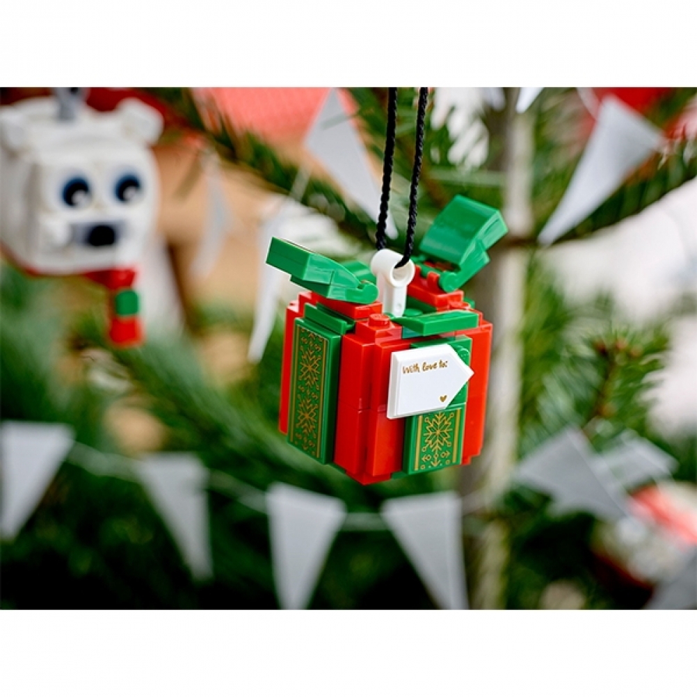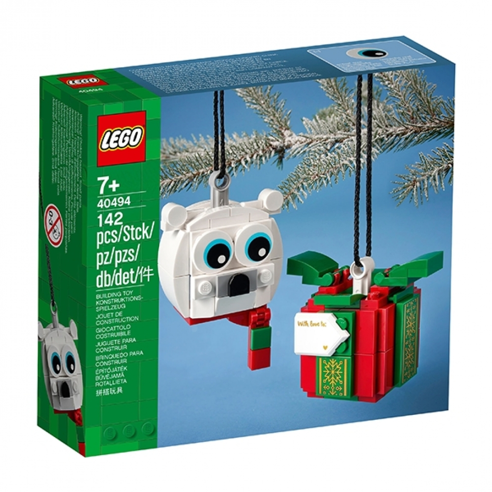 Il set Orso polare e scatola regalo LEGO® (40494) contiene un orso polare con sciarpa e un regalo costruibile con nastri mobili, adesivi dorati e un’etichetta “Con tanto amore a”, più un cordino per appendere ogni modello.