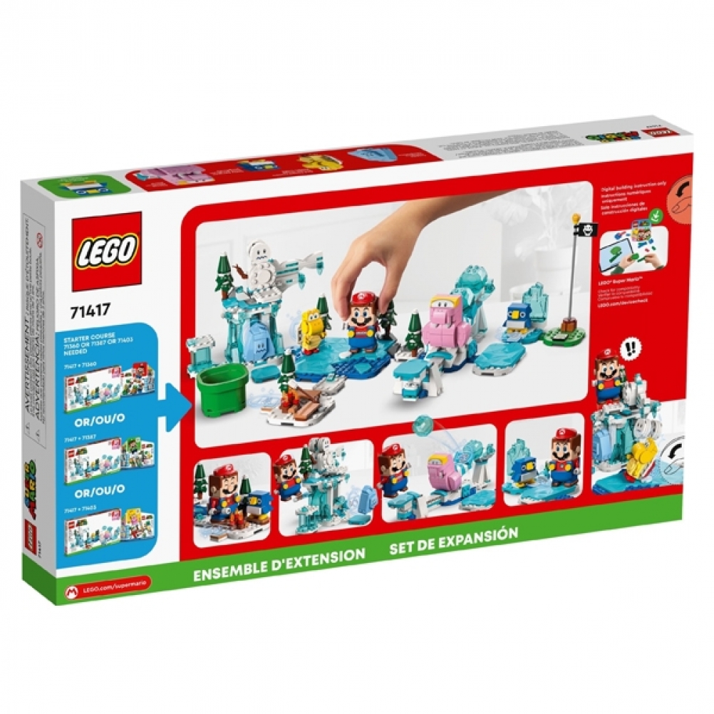 I bambini possono aggiungere un emozionante livello ghiacciato al loro mondo LEGO Super Mario con il Pack di espansione Avventura sulla neve di Tricherino (71417), contenente 4 personaggi Super Mario. I giocatori guadagnano monete digitali aiutando i personaggi di LEGO Mario, LEGO Luigi o LEGO Peach (non inclusi) a sconfiggere un Koopa rosso, un Surgelino e un Tricherino, a pattinare sul “ghiaccio”, a riscaldarsi accanto al “falò” e a regalare un frutto nascosto al baby Pinguotto. (Nota: per giocare è necessario lo Starter Pack 71360, 71387 o 71403.)