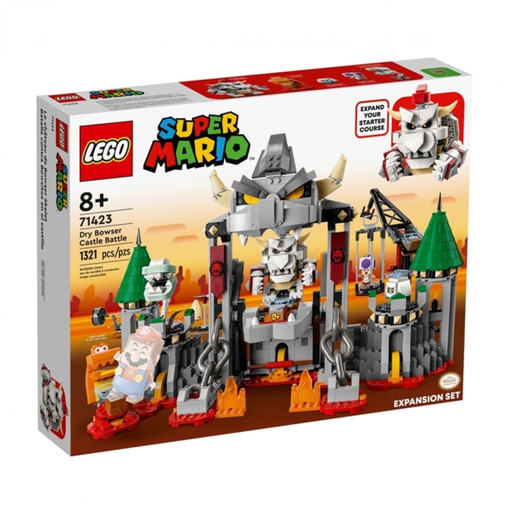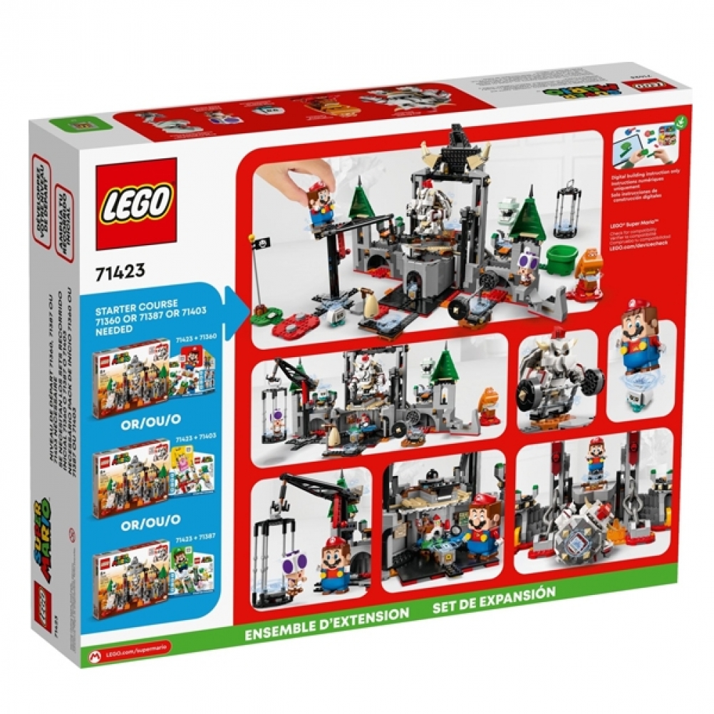 Crea una fantastica versione in mattoncini LEGO di una famosa ambientazione dell’universo di Super Mario con il Pack di espansione Battaglia del castello di Skelobowser (71423). I giocatori possono esplorare il castello con i personaggi interattivi di LEGO Peach, LEGO Mario o LEGO Luigi (non inclusi). Il set contiene un ingresso apribile a forma di mascella di Bowser, una gru per salvare Toad viola e abbattere Skelobowser, pinne per sconfiggere il Piantosso Piranha Ossea e il Goombosso, funzione di attacco del Magmabruto, palestra, ingresso segreto, stanza strategica segreta, blocco Chiave e di blocco Cassa del tesoro. Nota: per il gioco interattivo è necessario lo Starter Pack 71360, 71387 o 71403.