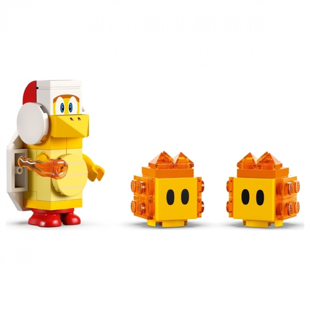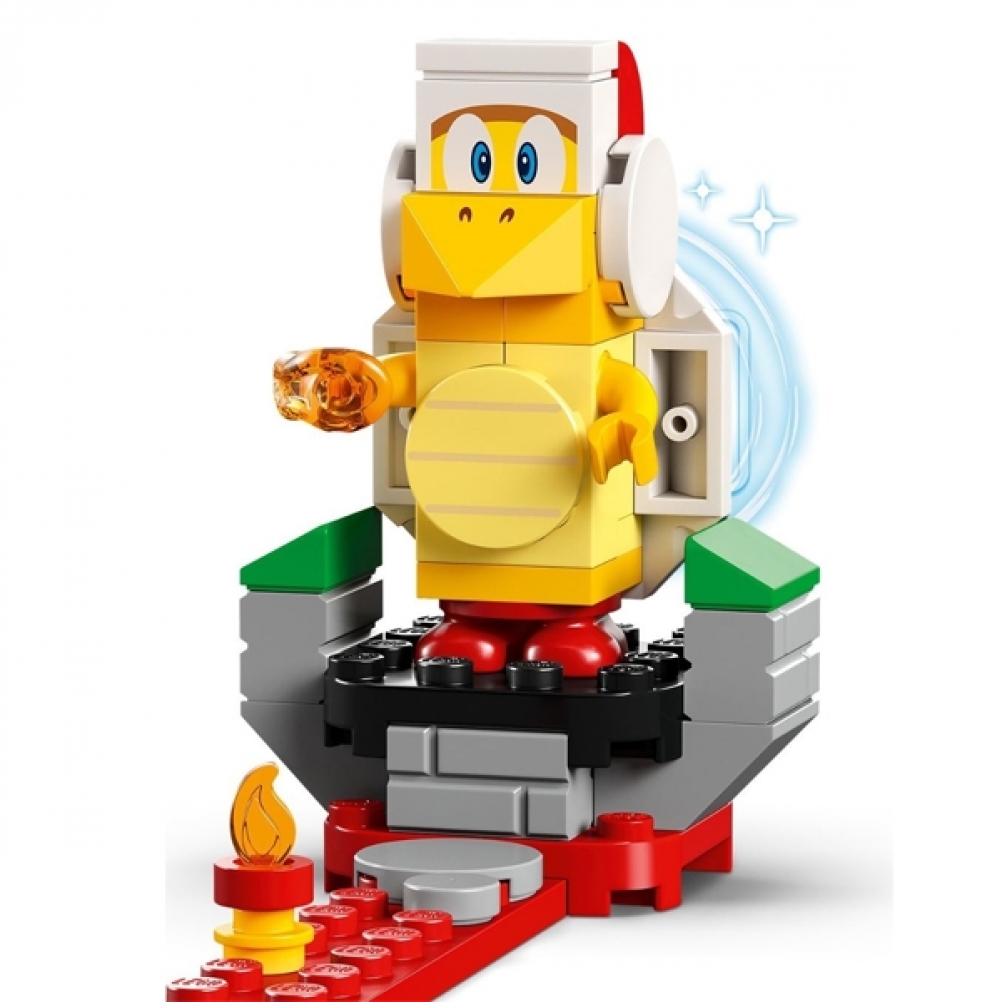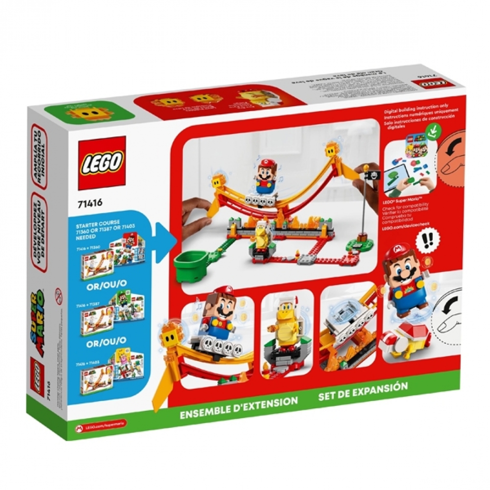 Con il Pack di espansione Giro sull’onda lavica (71416), i bambini possono creare un livello infuocato nel loro mondo LEGO Super Mario. Il pack contiene un’onda di lava oscillante con una piattaforma lavica su cui far salire il personaggio di LEGO Mario, LEGO Luigi o LEGO Peach (non inclusi). I giocatori guadagnano monete digitali se rimangono sull’onda in movimento e sconfiggono i 2 Fiammetti a ogni estremità. Il set, ideale per il gioco sociale, include anche un Fuoco Bros da sconfiggere.