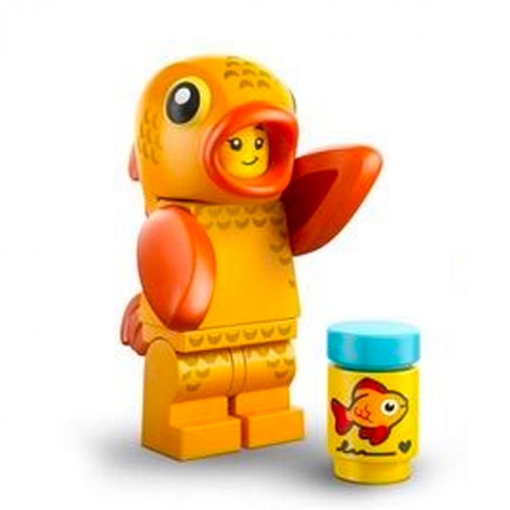 Un costume acquatico super simpatico! Il personaggio travestito da pesce porta con sé una confezione di cibo per pesci, pronto per tuffarsi nel divertimento.