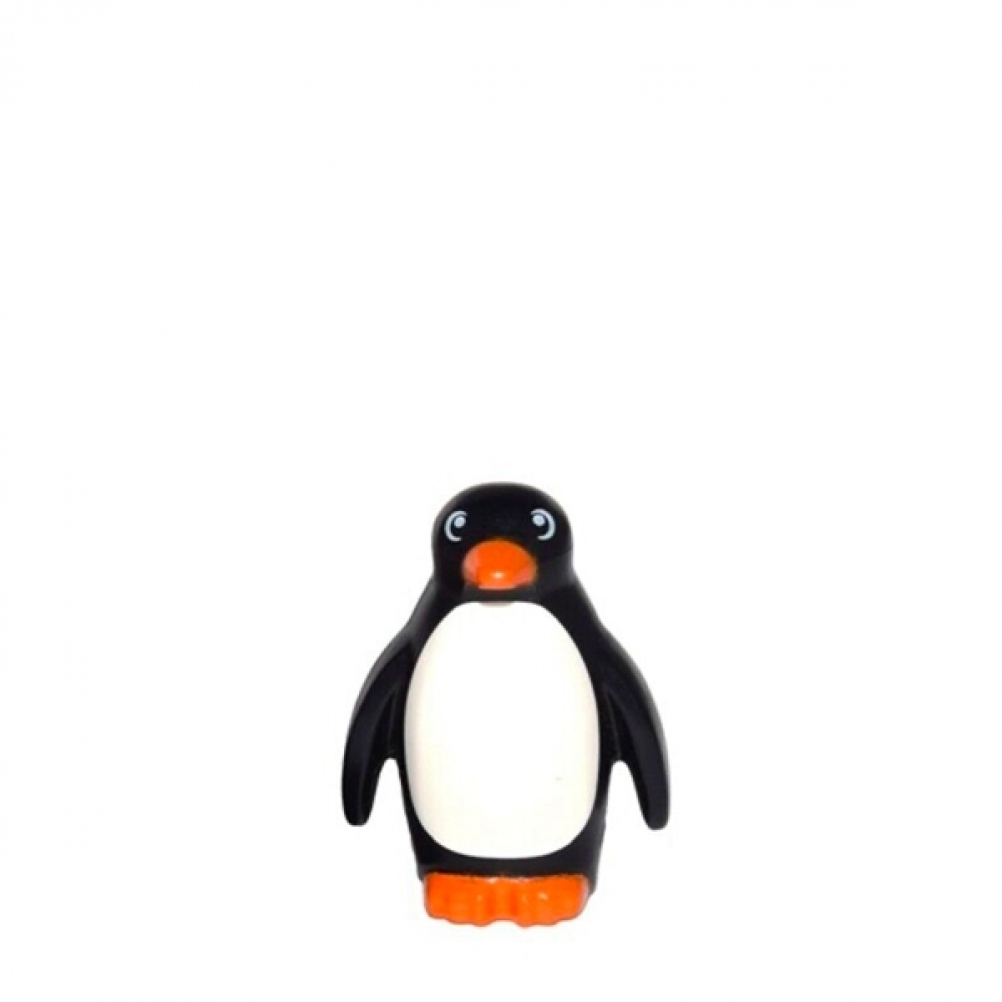 Elemento LEGO Pinguino (6160317) in plastica rigida, con corpo nero, pancia bianca e becco arancione stampato. Piccolo animale da ambientazioni invernali, set natalizi o scene naturalistiche. Pezzo singolo, senza accessori o base.