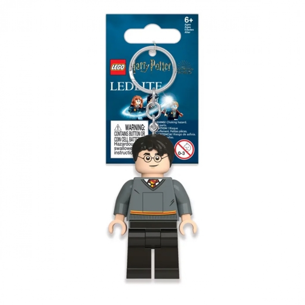 - Torcia-portachiavi di Harry Potter™: grande minifigure LEGO® di Harry Potter snodabile, con 2 luminose luci a LED nei piedi, fissata a un resistente anello con catena di metallo