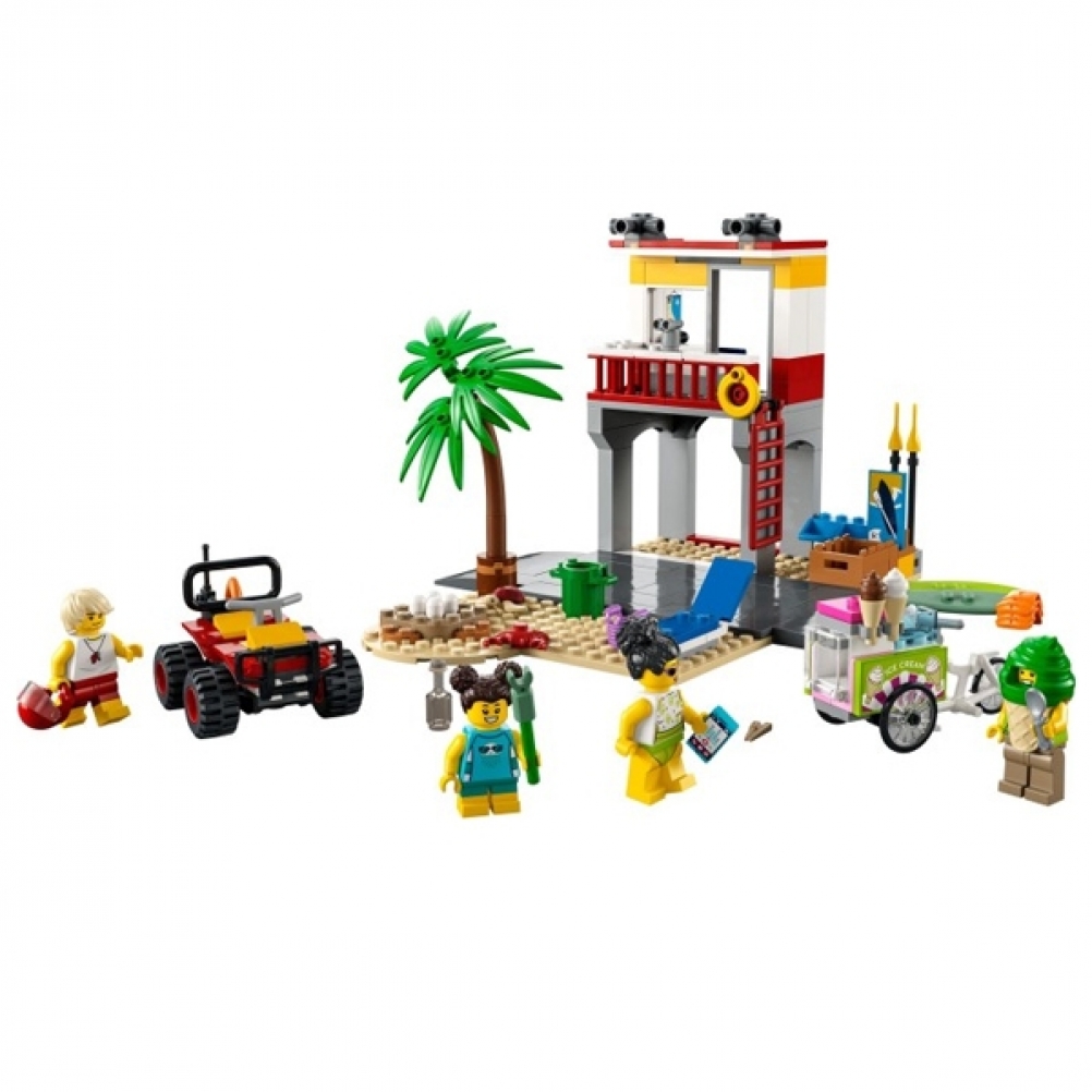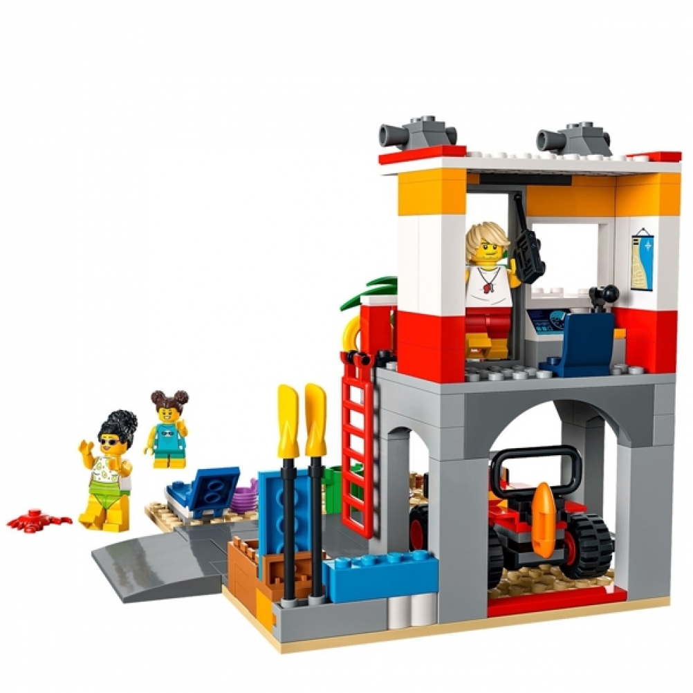 - Cosa c'è nella scatola? Tutto il necessario per costruire una postazione del bagnino a 2 piani, un ATV, un carretto dei gelati e l'ambientazione della spiaggia con una palma, oltre a 4 minifigure, un granchio e una tartaruga