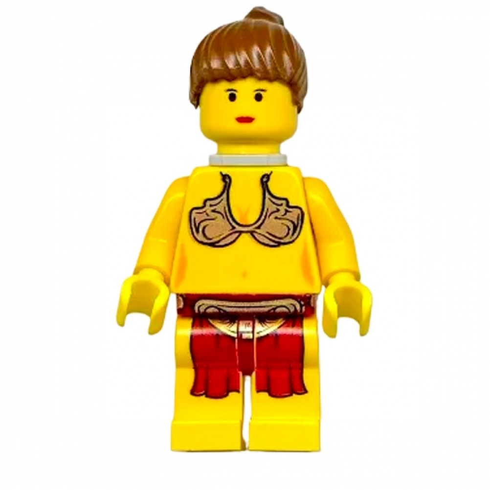 Minifigure LEGO® Star Wars che raffigura Principessa Leia nel celebre abito da schiava di Jabba, con pelle gialla classica LEGO e dettagli accurati del costume. Questa versione è apparsa in diversi set vintage, inclusi quelli degli anni 2000, ed è un pezzo iconico per i fan della saga.
