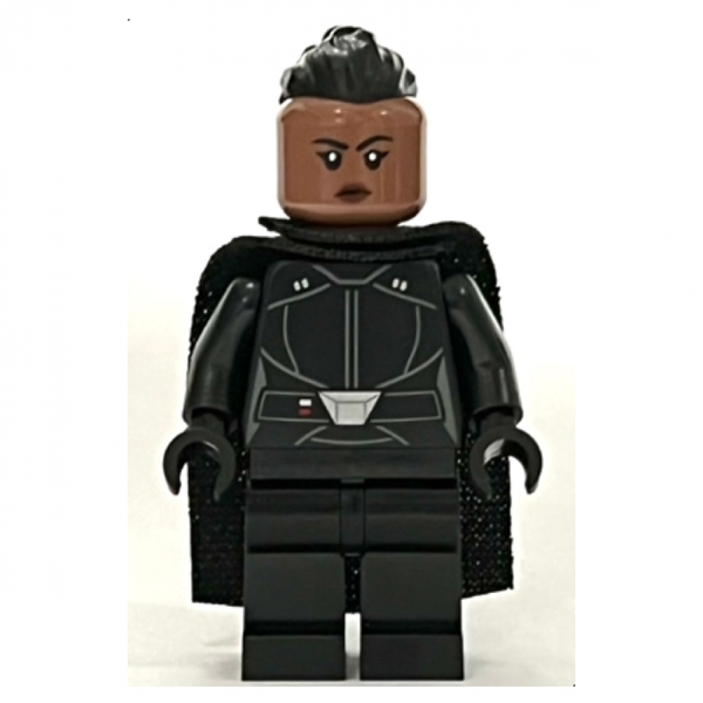 Indossa un’armatura nera completa con dettagli stampati sul torso che richiamano la divisa imperiale degli Inquisitori. Il volto mostra un’espressione determinata, e i capelli sono scuri raccolti in una coda alta.