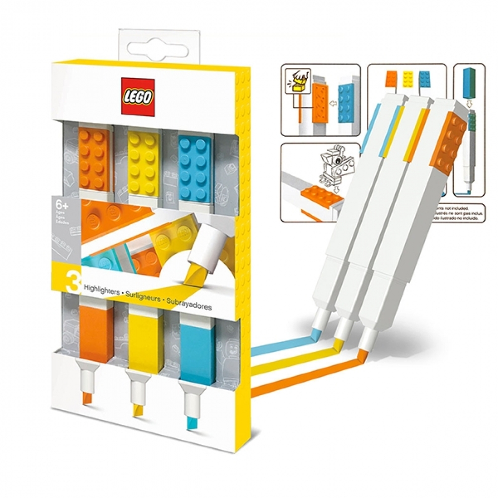 Questi evidenziatori LEGO in tre diversi colori possono essere personalizzati con i tuoi mattoncini o minifigure LEGO.