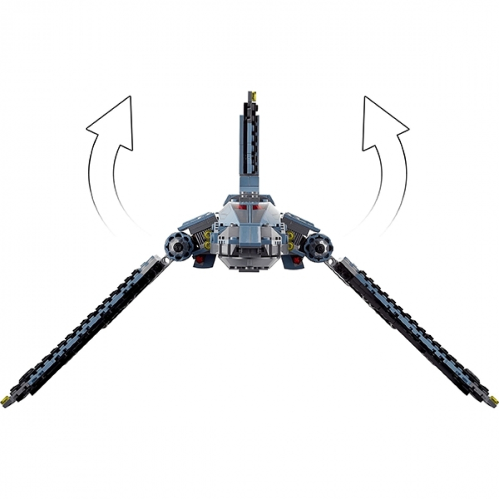 Lo shuttle giocattolo costruibile è dotato di ali regolabili per le modalità di atterraggio/volo, 2 shooter a molla, una pinna dorsale che si solleva per facilitare l’accesso all’abitacolo doppio per le minifigure LEGO® e una cabina dettagliata.