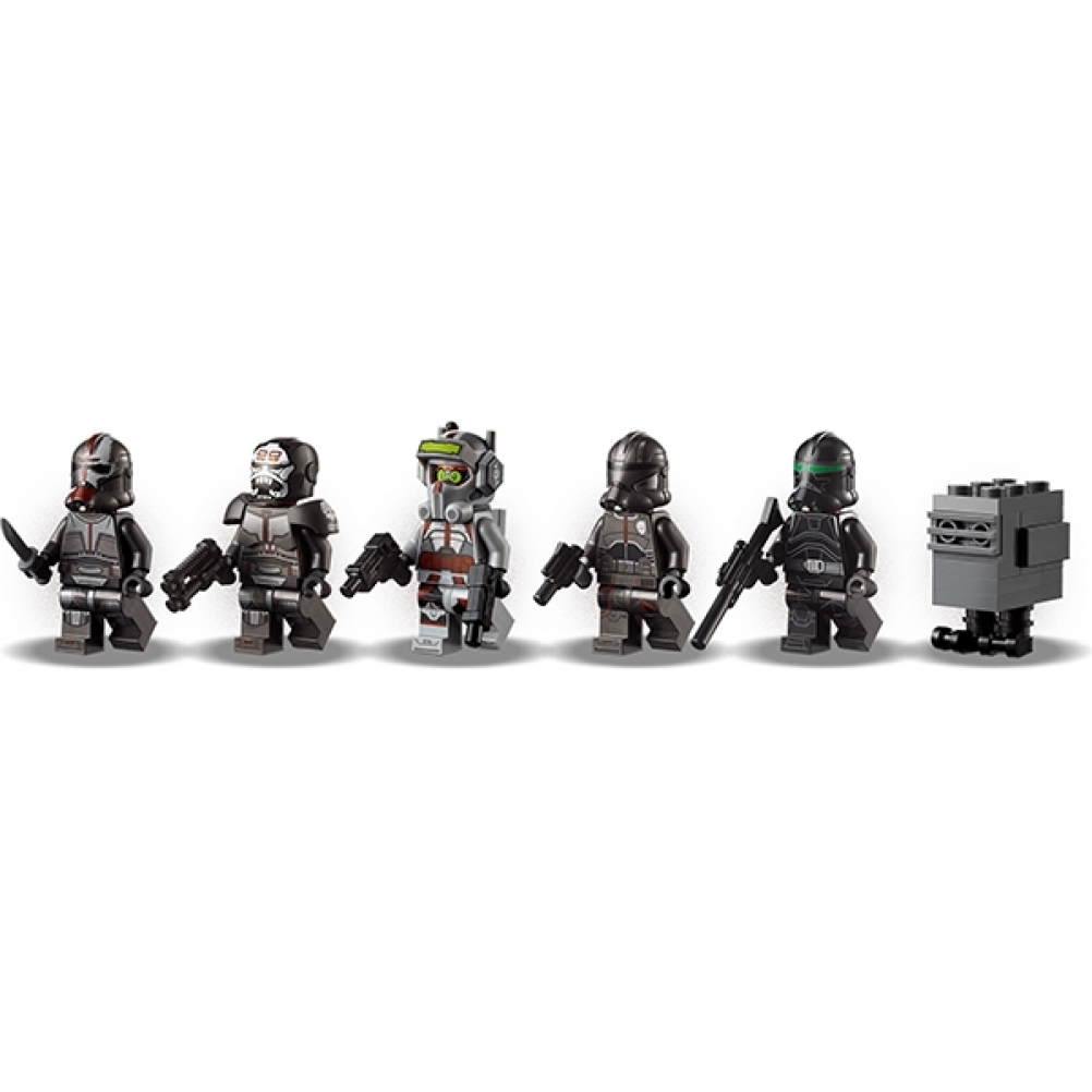 Include 5 minifigure LEGO® dei cloni Bad Batch che rappresentano la novità di agosto 2021: Tech, Echo, Hunter, Wrecker e Crosshair con armi assortite e lo zaino costruibile di Tech, oltre a un personaggio LEGO del Droide Gonk.