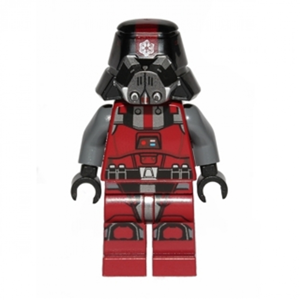 L'armatura rossa scura conferisce al Sith Trooper un aspetto distintivo e spaventoso, suggerendo una fedeltà assoluta ai Sith e alla loro causa. La minifigure è dotata di un elmetto che riflette l'aura minacciosa dei guerrieri Sith, con dettagli che suggeriscono una natura combattiva e pronta all'azione.