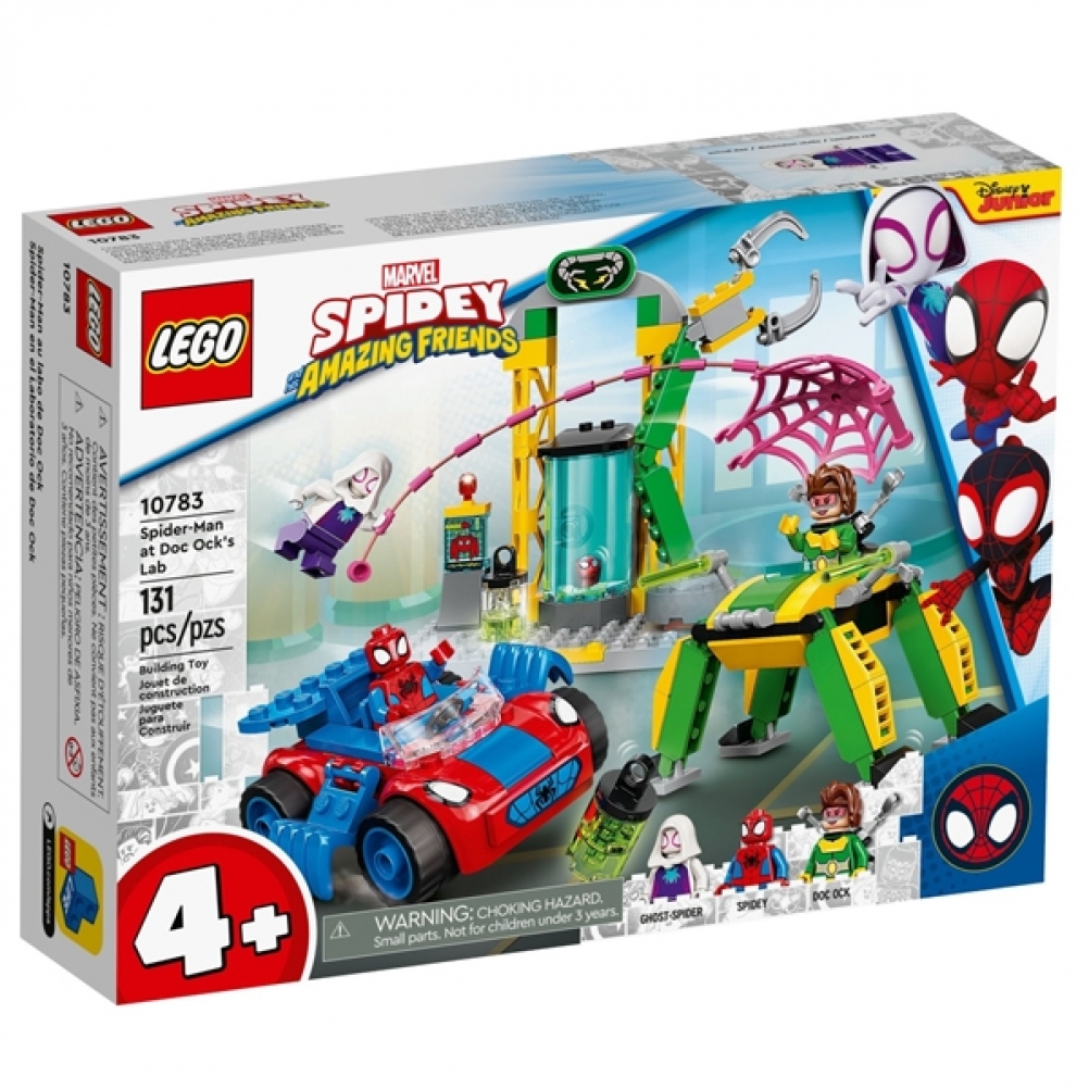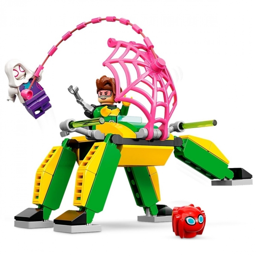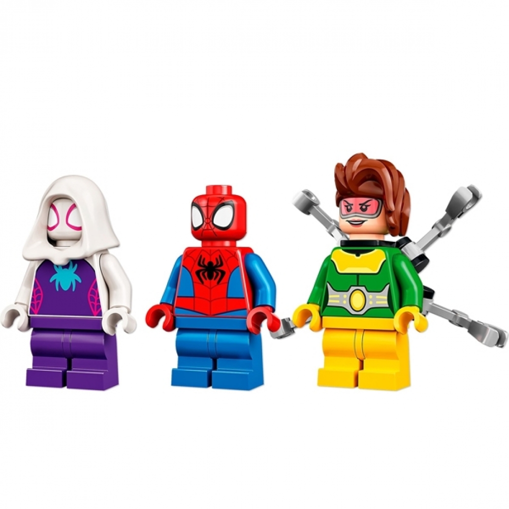 Questo set di gioco ricco di funzioni include un’auto di Spider-Man, il laboratorio e il mech di Doc Ock e 3 minifigure.