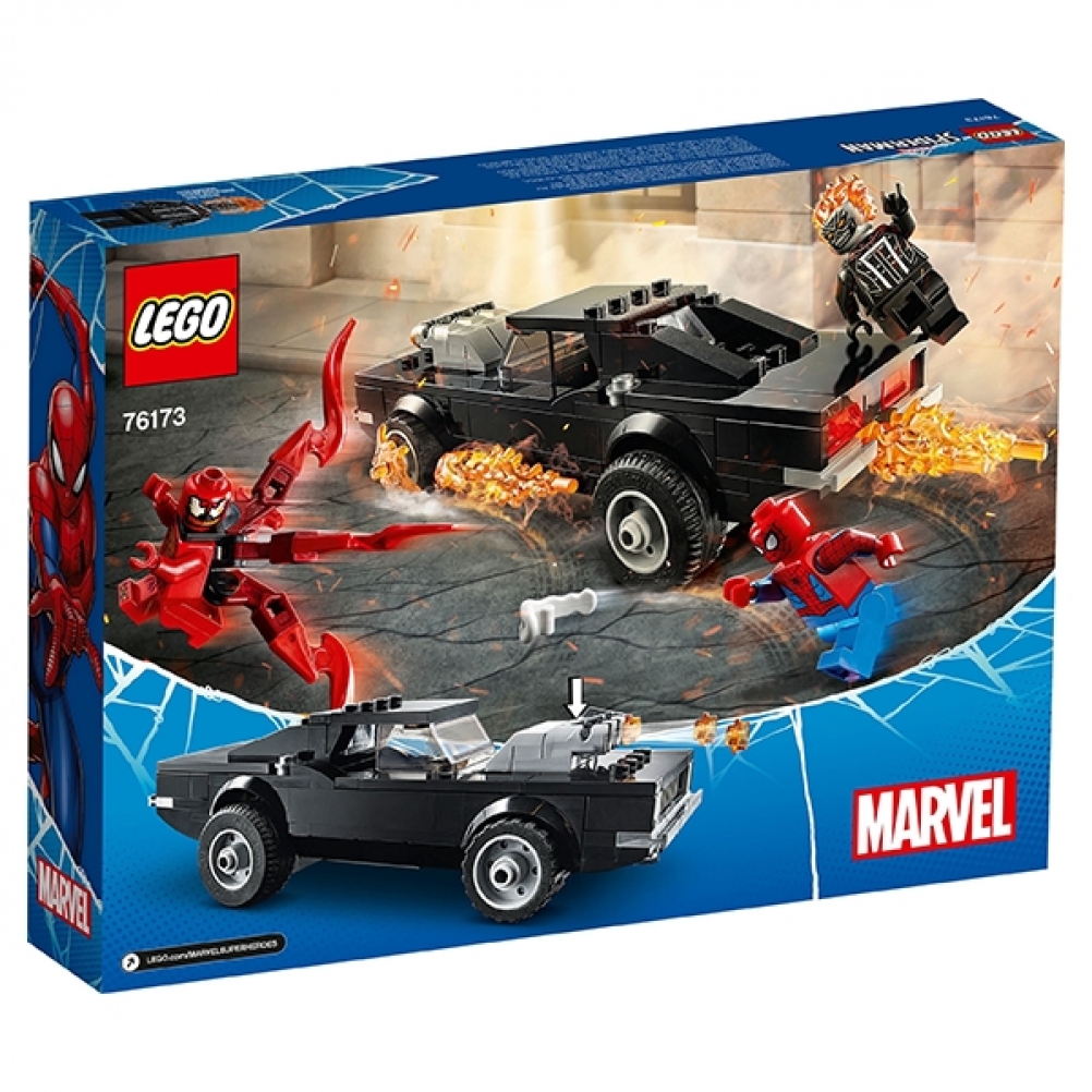 Include le minifigure di Spider-Man, Carnage e Ghost Rider. La robusta ma elegante auto di Ghost Rider è dotata di tettuccio rimovibile, fiamme rimovibili e turbo con shooter caricato con tre munizioni installato sul cofano.