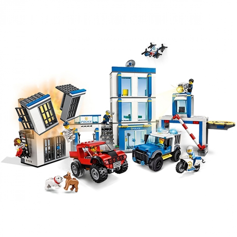 Cosa c'è nella scatola? Una stazione di polizia giocattolo, 2 veicoli, una moto e un drone. Contiene anche 6 minifigure, tra cui Duke DeTain, Chief Wheeler e Daisy Kaboom della serie TV LEGO® City, più 2 cani.