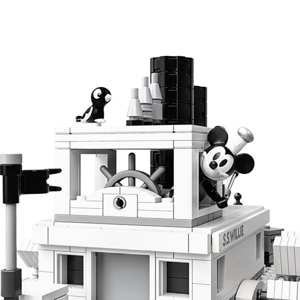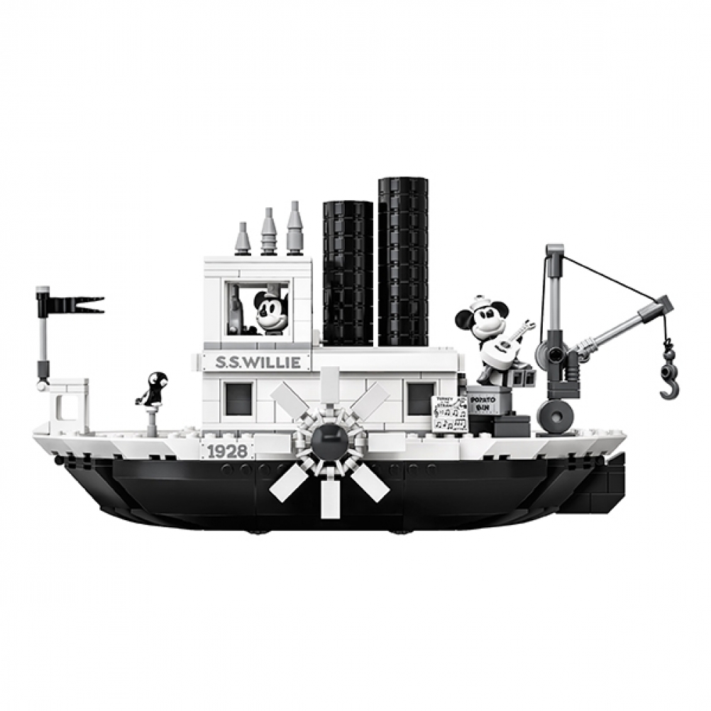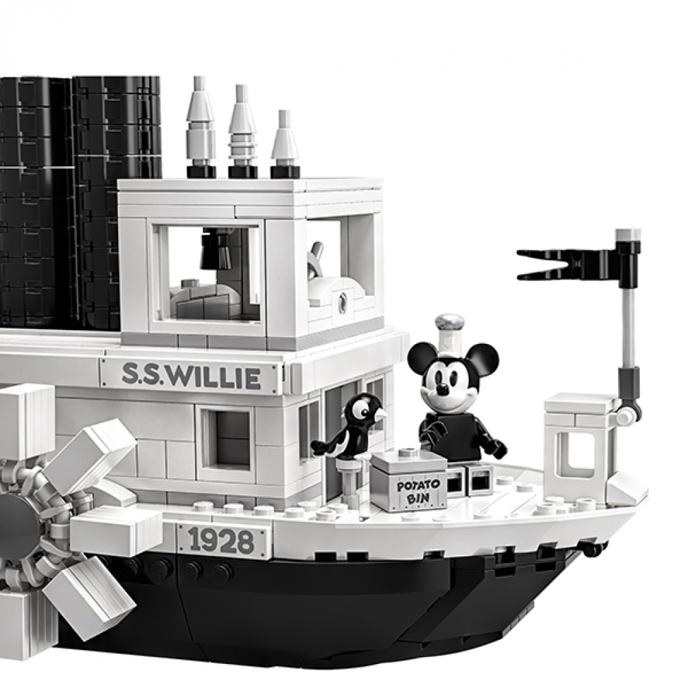 La versione in mattoncini LEGO della S.S. Willie è dotata di fumaioli mobili e di ruote a pale che girano quando la barca viene spinta in avanti. Il ponte della barca ha spazio per una minifigure e dettagli nautici che ispirano il gioco, come il timone, il salvagente e la campana costruibile. Sul ponte c’è anche una gru funzionante per sollevare a bordo il “contenitore delle patate” e questo originale set di gioco contiene anche le minifigure di Topolino e di Minni - novità di aprile 2019 - ognuna con una speciale decorazione color argento, più un pappagallo.
