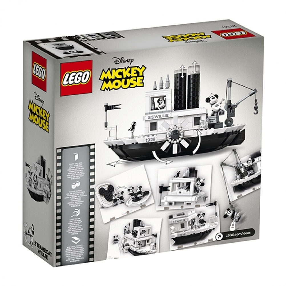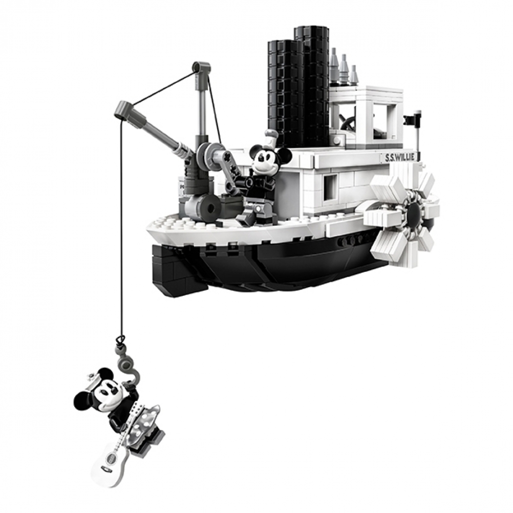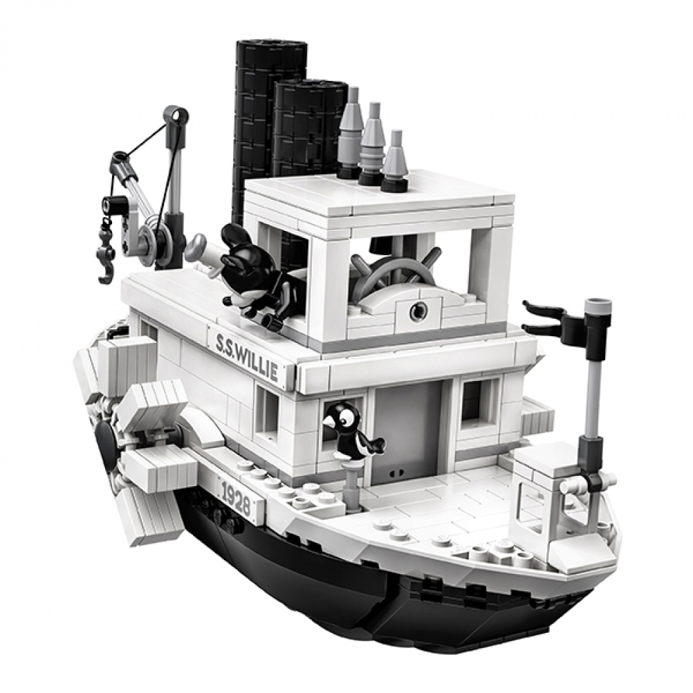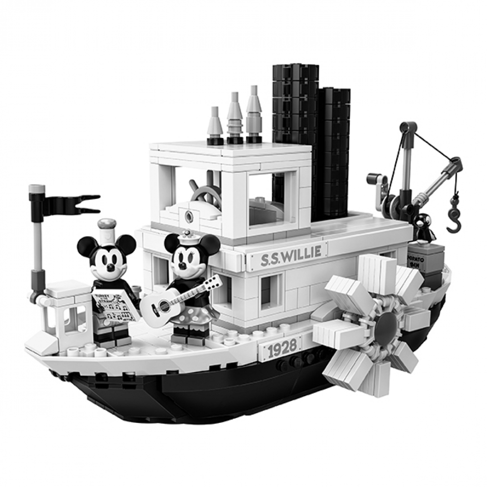 La versione in mattoncini LEGO della S.S. Willie è dotata di fumaioli mobili e di ruote a pale che girano quando la barca viene spinta in avanti. Il ponte della barca ha spazio per una minifigure e dettagli nautici che ispirano il gioco, come il timone, il salvagente e la campana costruibile. Sul ponte c’è anche una gru funzionante per sollevare a bordo il “contenitore delle patate” e questo originale set di gioco contiene anche le minifigure di Topolino e di Minni - novità di aprile 2019 - ognuna con una speciale decorazione color argento, più un pappagallo.