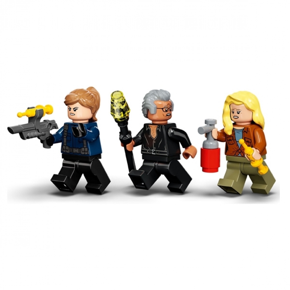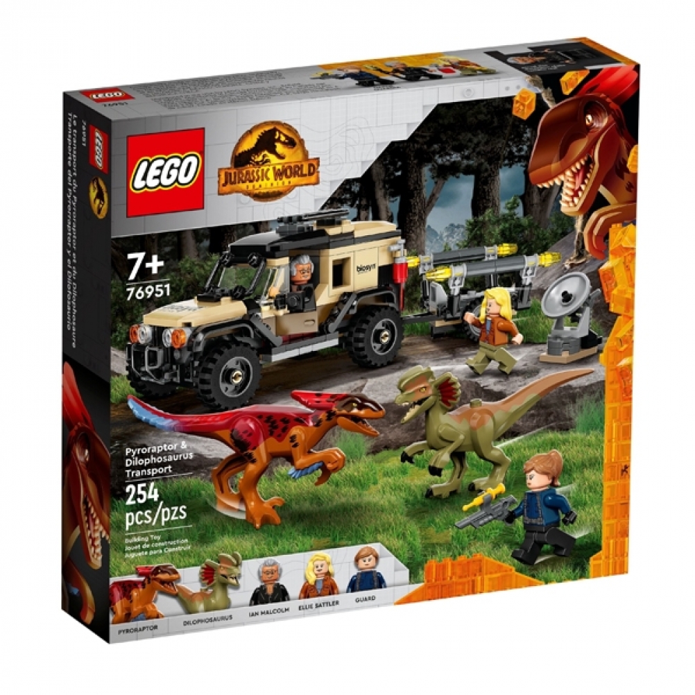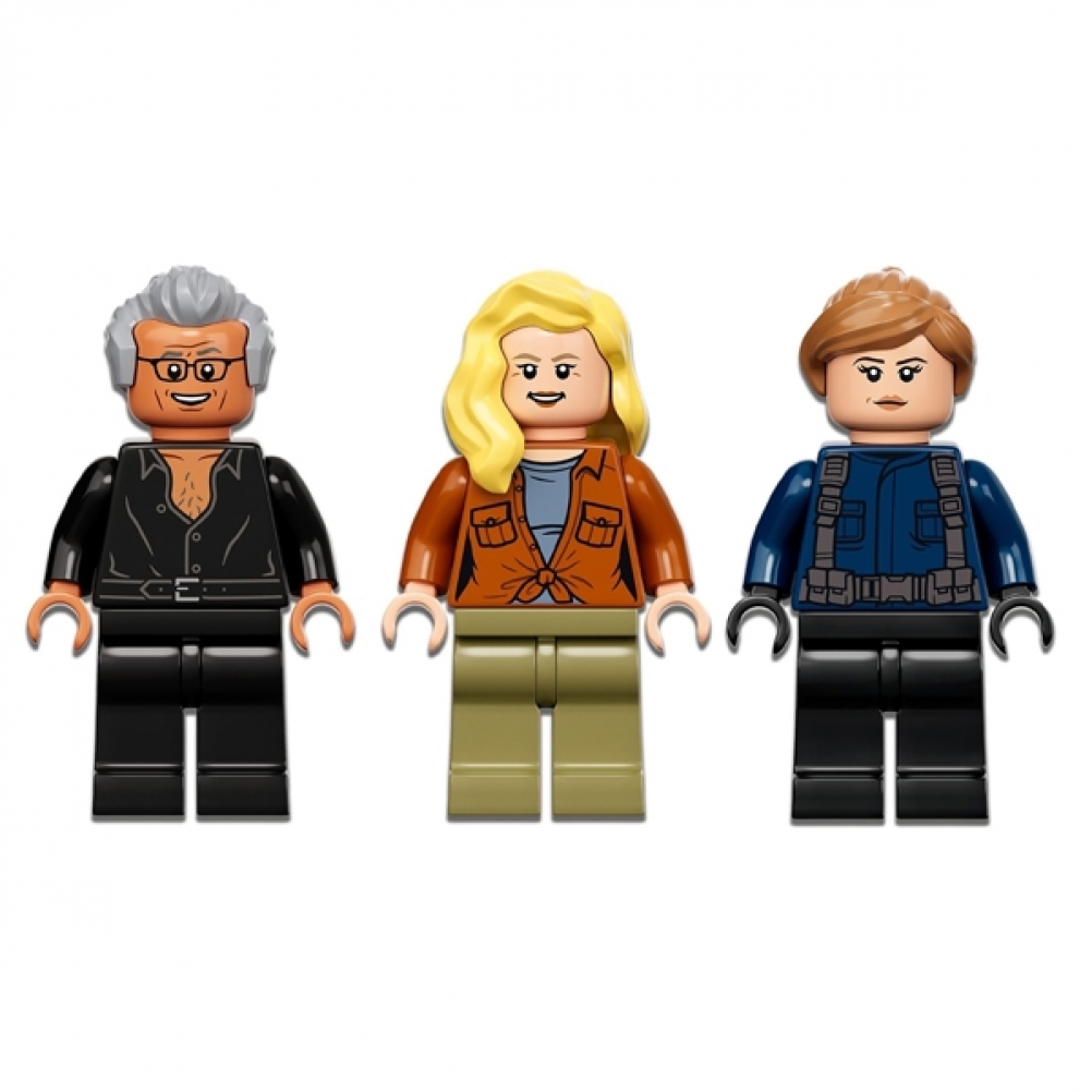 - 3 minifigure e 2 dinosauri giocattolo: Ian Malcom, Dott. Ellie Sattler e una guardia, più un Piroraptor e un Dilofosauro snodabili per ricreare le scene del film Jurassic World Dominion