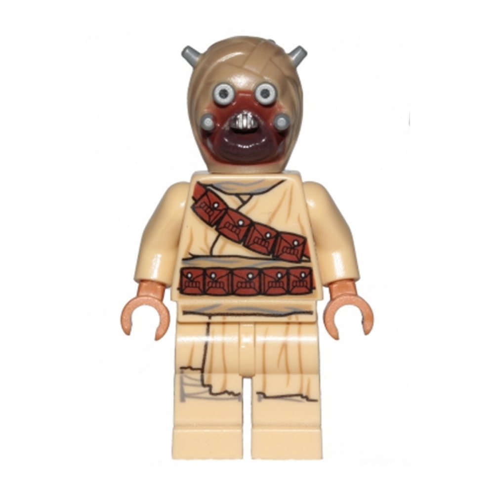 Minifigure LEGO Star Wars Tusken Raider (SW1074) con dettagliata stampa del busto e della testa, caratterizzata da spuntoni sul capo e cintura diagonale. Senza accessori (bastone gaffi non incluso).