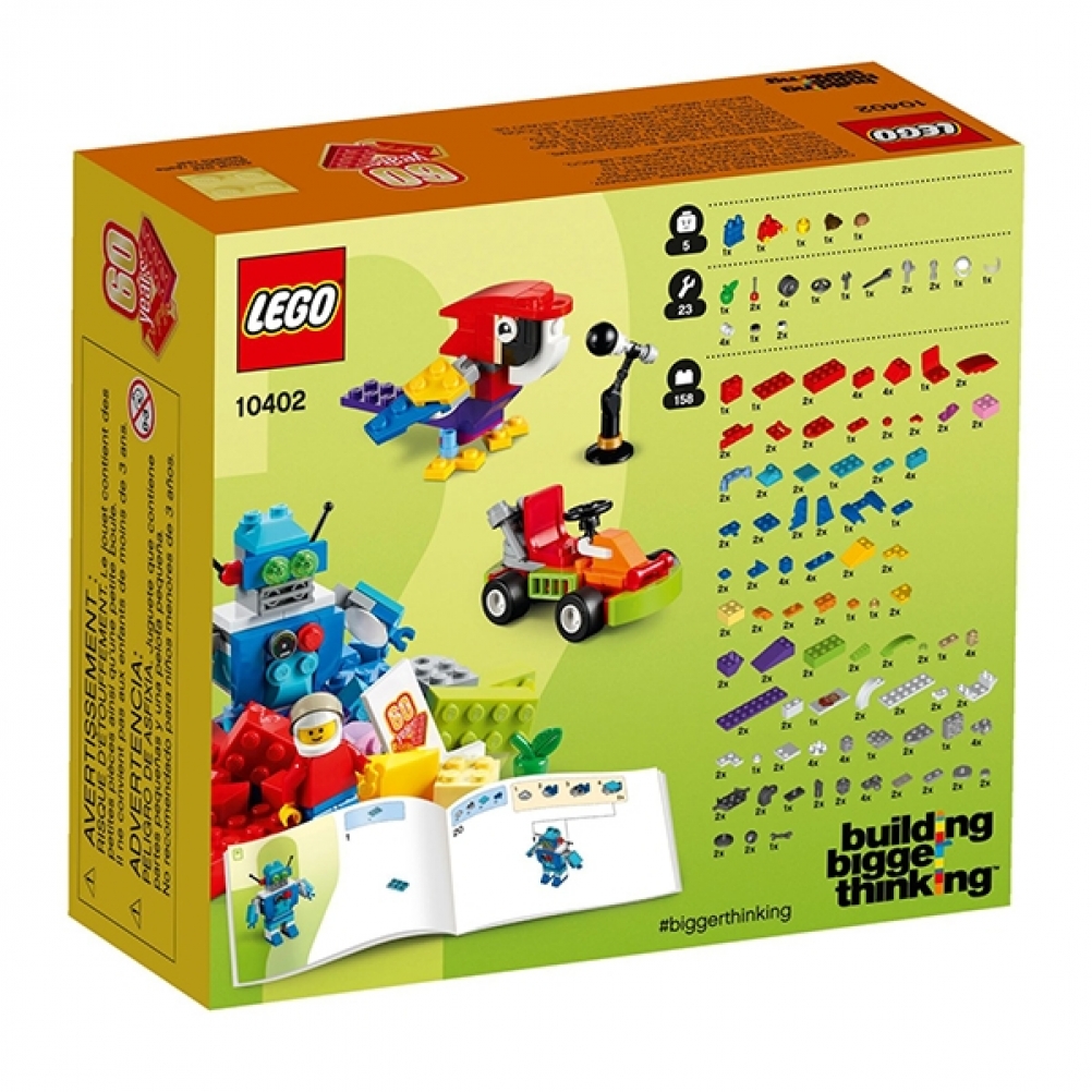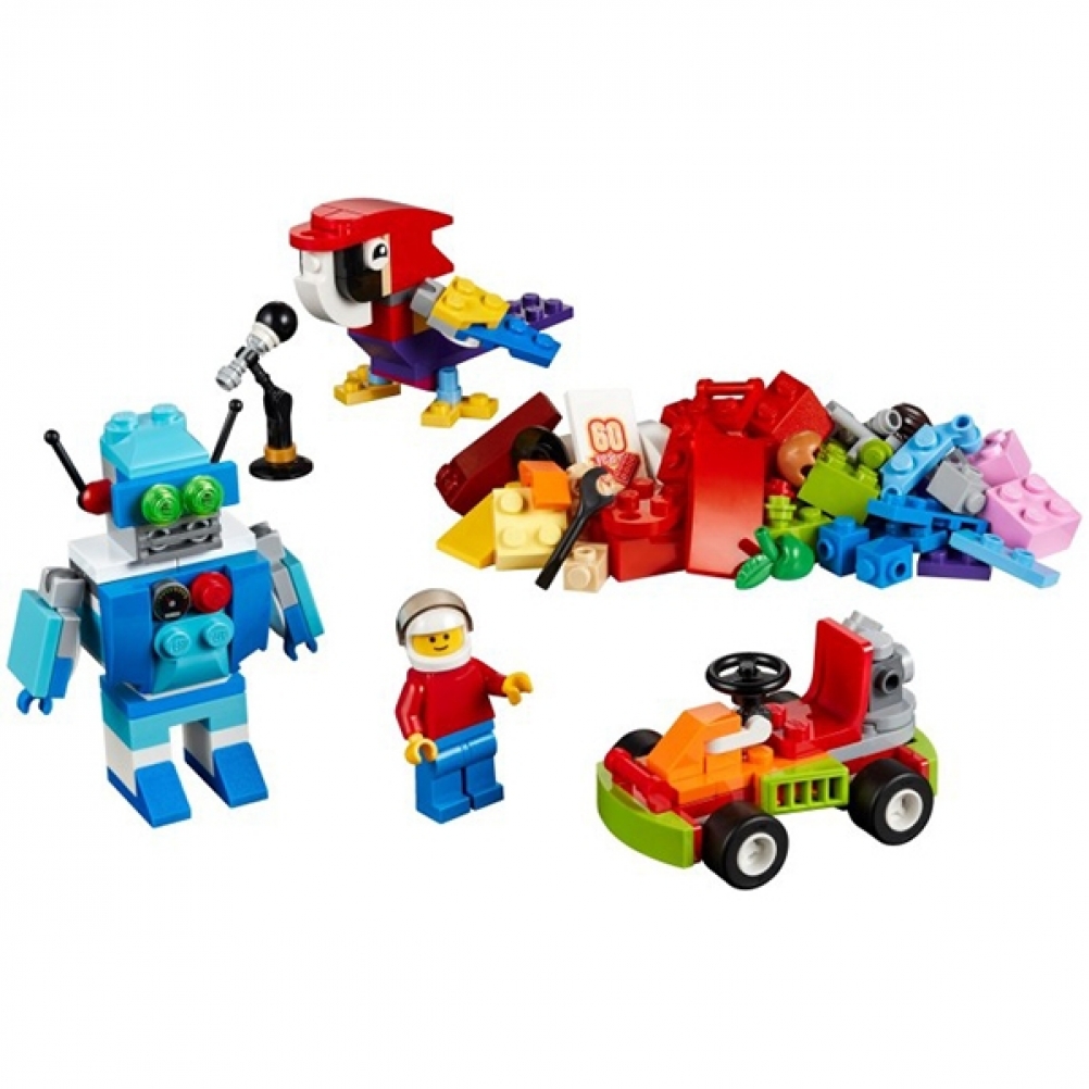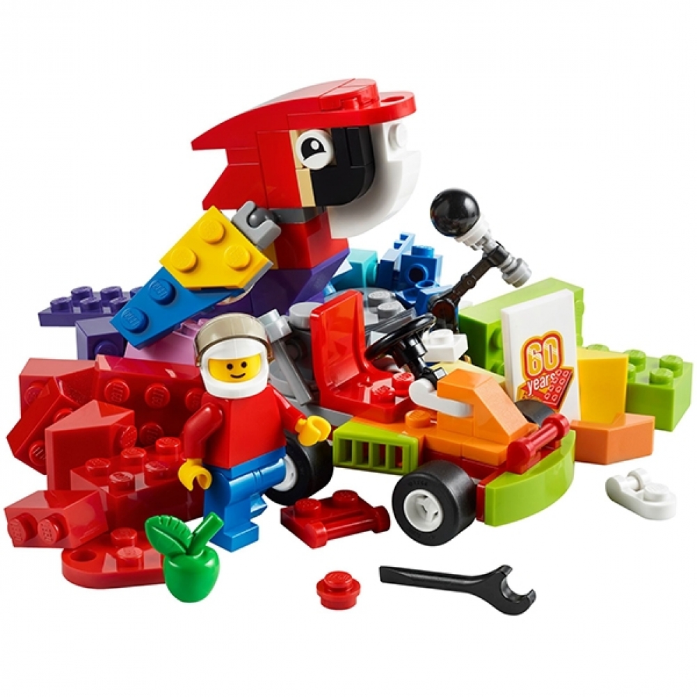 Contiene un mix di pezzi LEGO® brillanti e colorati per tanto gioco creativo, pezzi speciali, tra cui ruote, forme e occhi, e una “tegola” Special Edition per festeggiare i 60 anni del mattoncino LEGO.