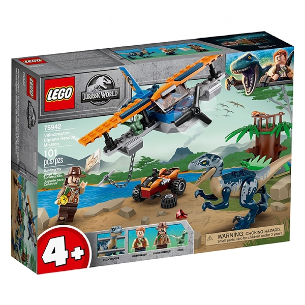 Il biplano ha un telaio Starter Brick per rendere più facile la costruzione e un elemento a catena per le missioni di salvataggio, ei giovani possono interpretare storie emozionanti con 2 minifigure di Jurassic World: Owen Grady e Sinjin Prescott.