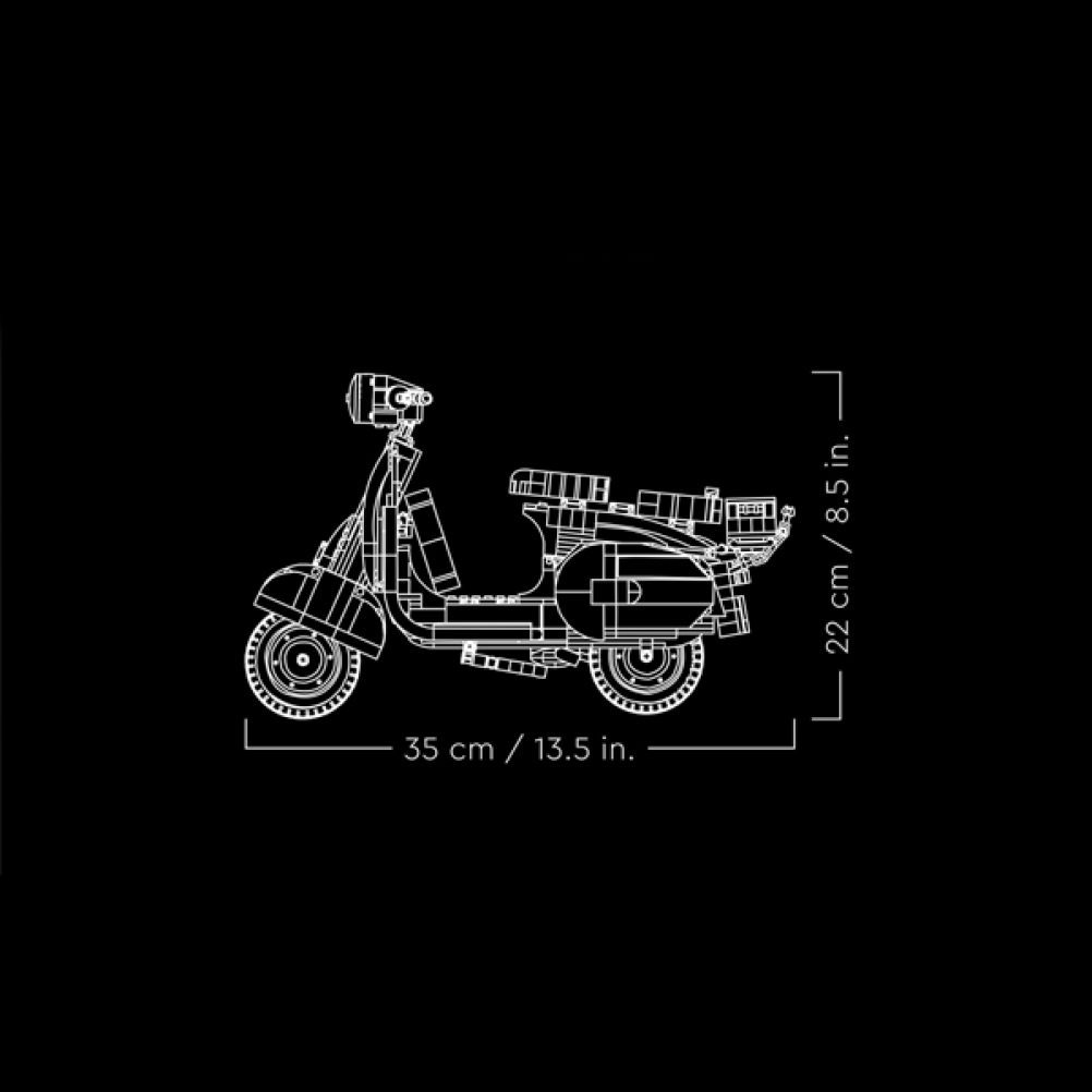 Come l'originale, questo modello di Vespa costruibile è caratterizzato da una ruota anteriore montata su un lato, 2 sedili, una copertura rimovibile che ricopre un motore in mattoncini, un cavalletto funzionante, così come lo sterzo.