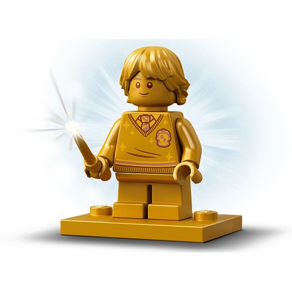 Include un’esclusiva minifigure di Ron Weasley™ d’oro per celebrare i 20 anni di magia con LEGO® Harry Potter™ e 4 tessere a sorpresa delle carte dei maghi da collezionare (16 in totale)