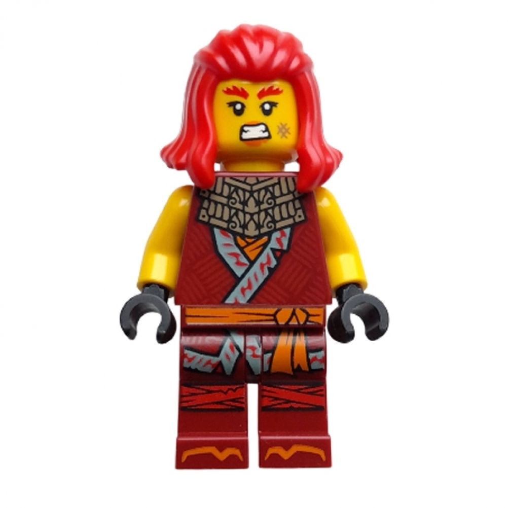 Minifigure di Wyldfyre della serie Ninjago: Dragons Rising. Presenta torso stampato con tunica rosso scuro e dettagli dorati, gambe rosse con decorazioni arancioni e braccia rosse. La testa mostra un volto con espressione determinata e capelli rossi, fedele all’aspetto del personaggio.